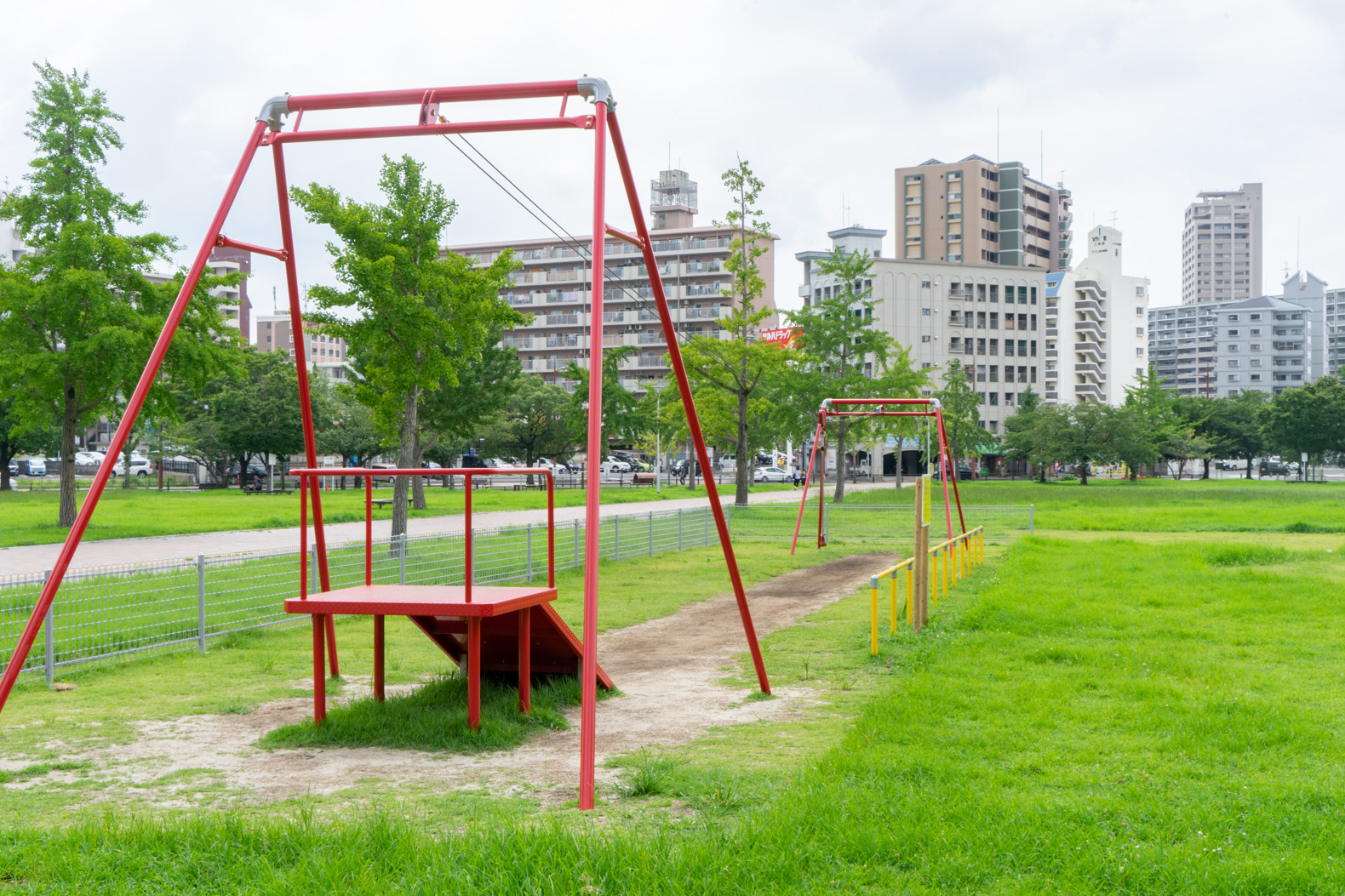 プロ野球の公式戦も行われる「北九州市民球場」や球技場、体育館など、運動公園にふさわしい設備が揃う「三萩野公園」。「メディアドーム」に隣接する芝生広場の中にある遊具エリアに行ってきました。芝生が敷かれているので太陽光の照り返しも少なく、気候がよくなってきたら、青空の下、レジャーシートを敷いて寝っ転がるのも気持ちが良さそうな公園です。