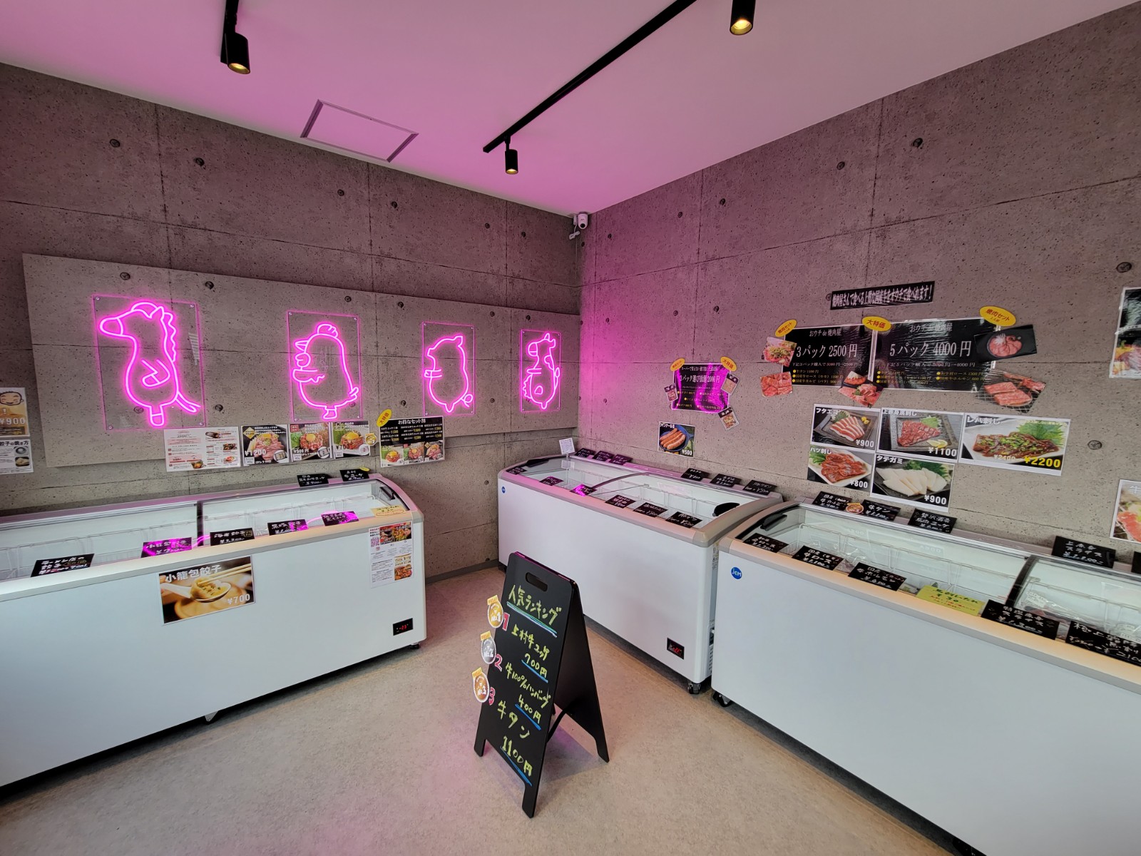 ピンク色のネオンがほんのり照らす店内に設置された冷凍庫には、焼肉用の国産牛をはじめ、ユッケや馬刺し、ハンバーグ、餃子などの冷凍商品がズラリと並びます。牛肉は、モモやカルビ、タンなど部位ごとに販売。豚肉、鶏肉、馬肉も揃います。対象商品5種類の中から好きなお肉を3種類選ぶとお得に購入できる「3パック選び放題2000円」などもありました。