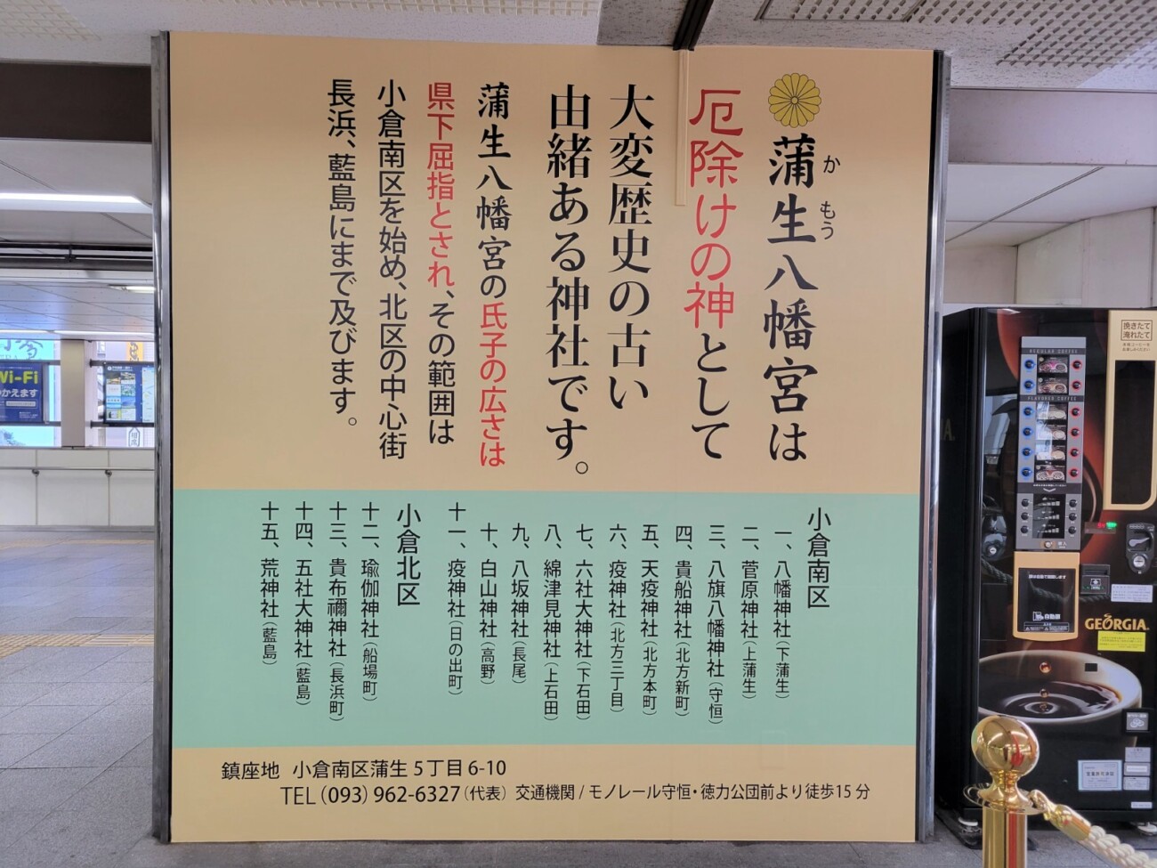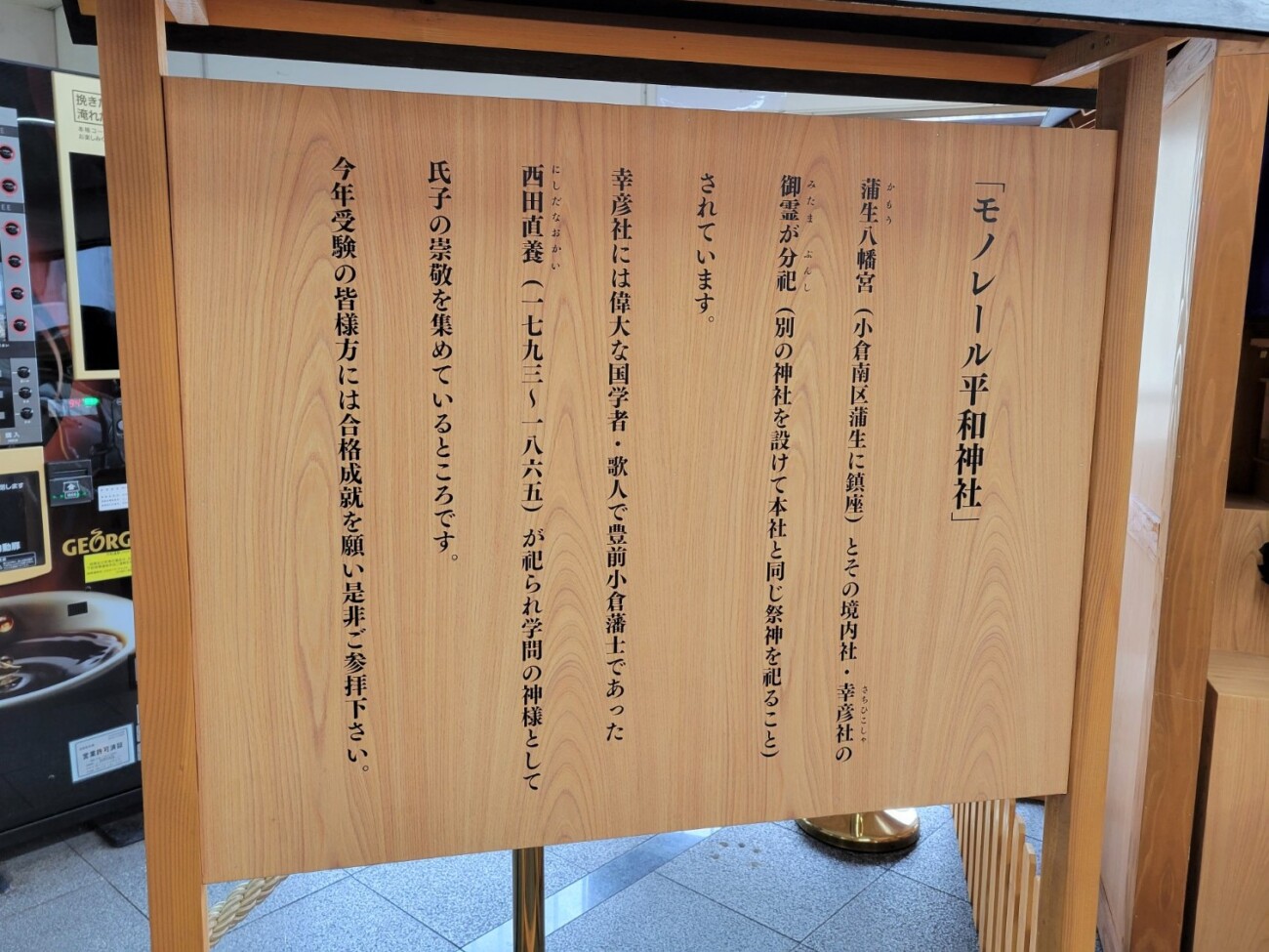 受験シーズンに合わせ、2011年から毎年設置されている「モノレール平和神社」には、小倉南区蒲生(がもう)に鎮座する「蒲生(かもう)八幡宮」と、その境内社「幸彦社」の御霊が分祀されています。