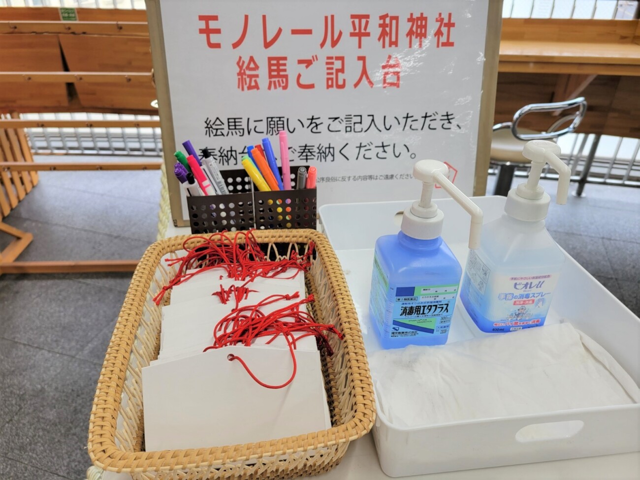 「モノレール平和神社」には絵馬の記入台も用意されているので、「合格祈願絵馬」に願い事を記入し、そのまま奉納することができます。