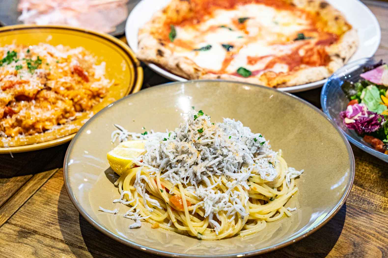 「マルゲリータ」などのピザは、400度の高温で1分30秒という短い時間で一気に焼き上げられます。そのため、外側の耳の部分はモチモチ、生地全体はあっさりサクサクとした軽やかな味わいで何枚でも食べられそうです。トイレにおむつ替え台もあるので、小さな子どもも一緒に連れて行きやすく、パパママにも喜ばれそうなお店です。