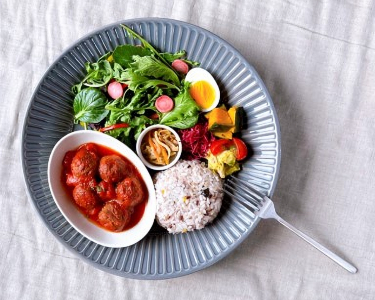 看板メニューは日替わりの「腸活ランチプレート」。「野菜類50%、肉魚類30%、穀物類20%の食材比率で構成しており、季節ごとに旬のものを腸活メニューにアレンジして提供しています」と広報担当の阿南さんが話してくれました。普段の生活ではどうしても野菜不足になりがちなので、この心遣いは嬉しいですね。