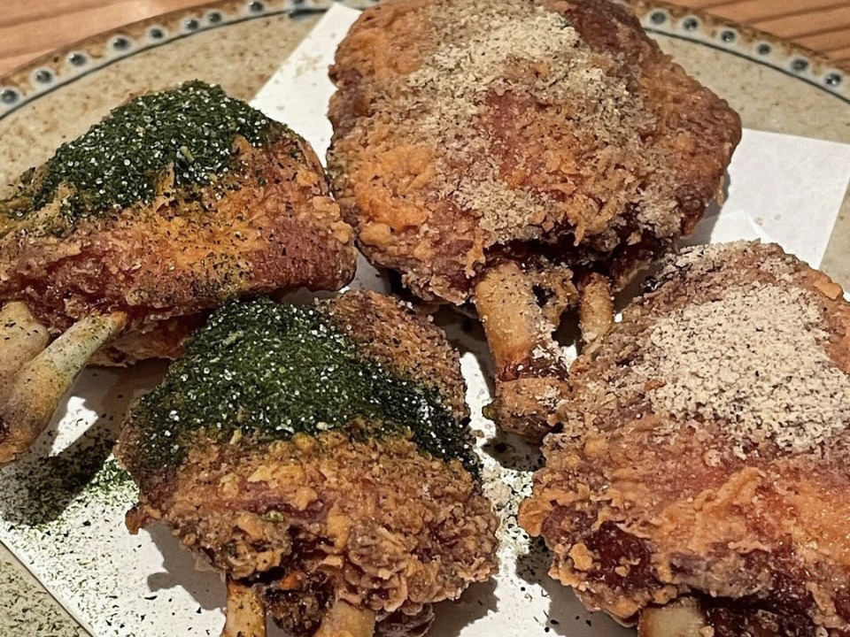 まずは可愛らしいフォルムに癒される「手羽先唐揚げ」。マジックパウダーや青のりが味が特に美味しくて、骨の外し方も丁寧に教えてくれるので手を汚さずにペロっと食べちゃいます。
