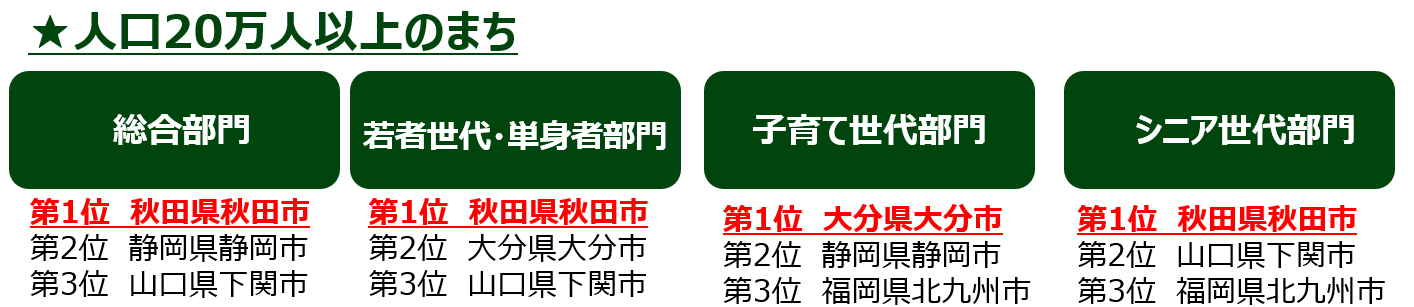 その最新のランキングが発表され、北九州市は「人口20万人以上のまち」の【子育て世代部門】【シニア世代部門】でそれぞれ3位にランクインしました。