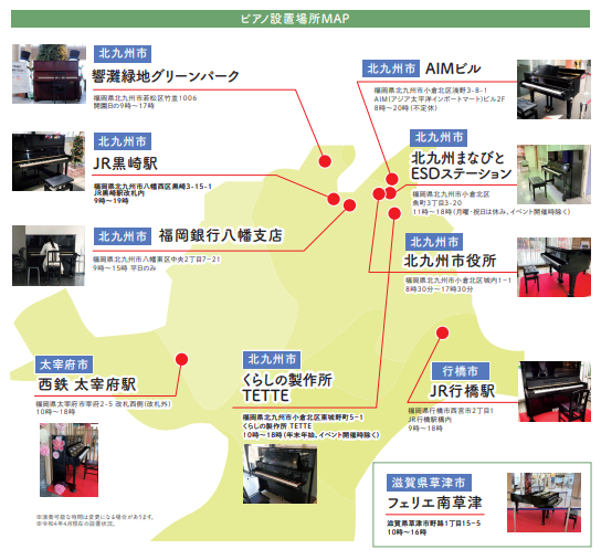 理事3人・監事1人の計4人で活動するストリートピアノドネーションズ。同団体が設置したストリートピアノは、北九州市内に7台、おとなり行橋駅と太宰府駅(西鉄)、県外は滋賀県草津市に各1台の計10台です。市内1番目は4年前、JR黒崎駅の改札内に設置されました。