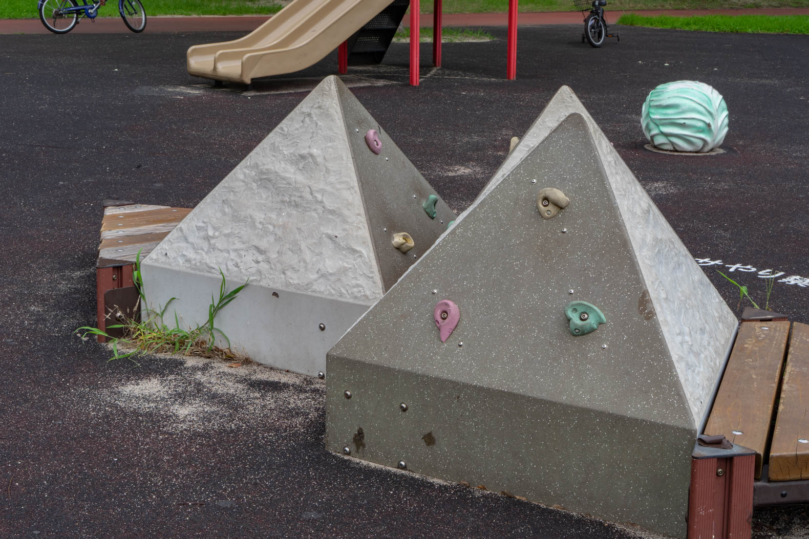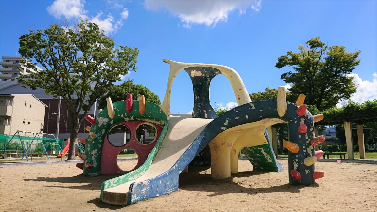 ただ公園内で異質な存在感を放っているのは、カラフルな謎のデザインのすべり台。何をデザインしているのかは謎ですが、そんなことは気にせず、子どもたちはトゲトゲをよじ登ったり、丸い穴をくぐったり、楽しそうに遊んでいました。