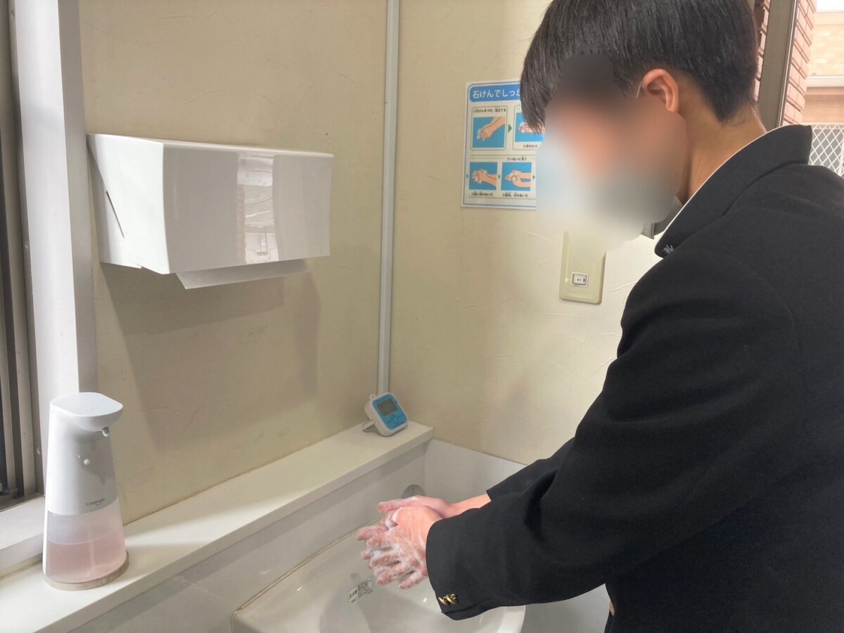 手をかざすだけでスタートする30秒タイマーが設置されているのですが、記者も実際にタイマーを使い、手洗いを体験させてもらったところ、「30秒ってこんなに長いのか」と驚き、普段こんなに長くしっかりと手洗いをしていないなと反省させられました。このタイマーを設置したことによって、生徒たちはしっかりと手洗いをするようになったとのことです。