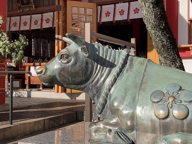 天満宮らしく御神牛もいました。御神牛は「頭を撫でると賢くなれる」「ケガや病気などがある場所を撫でると回復する」という言い伝えもあり、みんなから撫でられたのか、つやつやしている箇所も見られました。