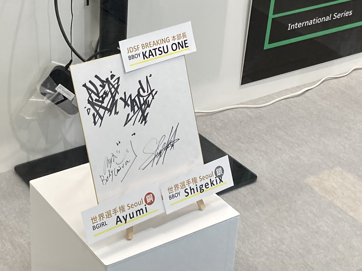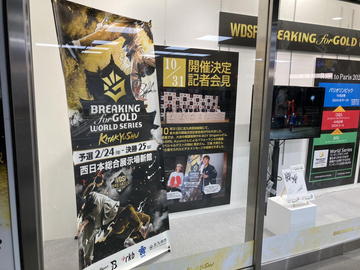 「WDSF Breaking for Gold World Series in 北九州」大会情報や世界で活躍するブレイキン選手についてのパネル、選手のサインなどが展示されていました。