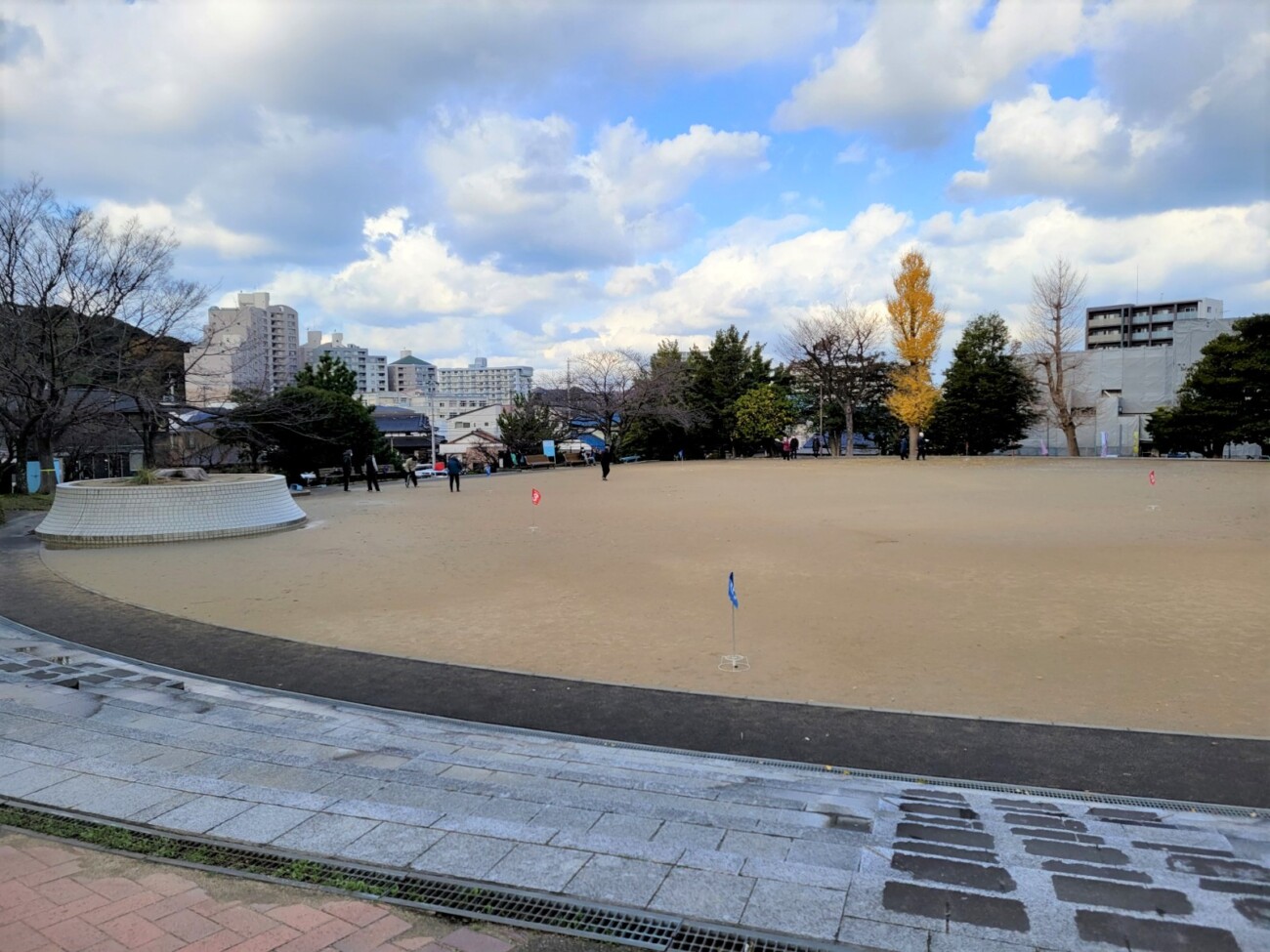 子ども向けの遊具、健康遊具が設置された広場から一段下がった部分には、広々としたグラウンドが広がります。