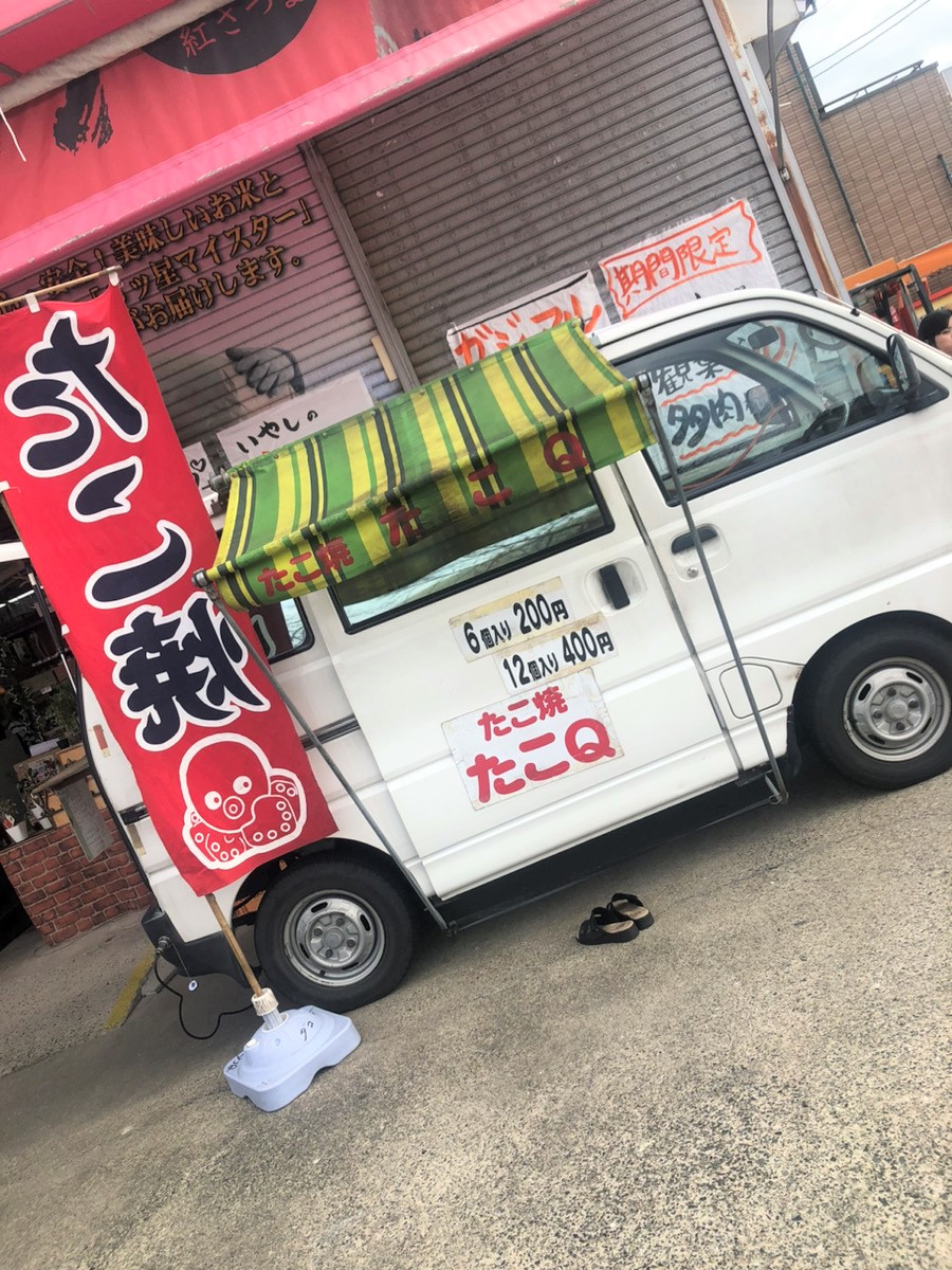 昔ながらのたこ焼き屋さんで、『たこ焼き』の提灯を掲げた軽トラックが目印です。
