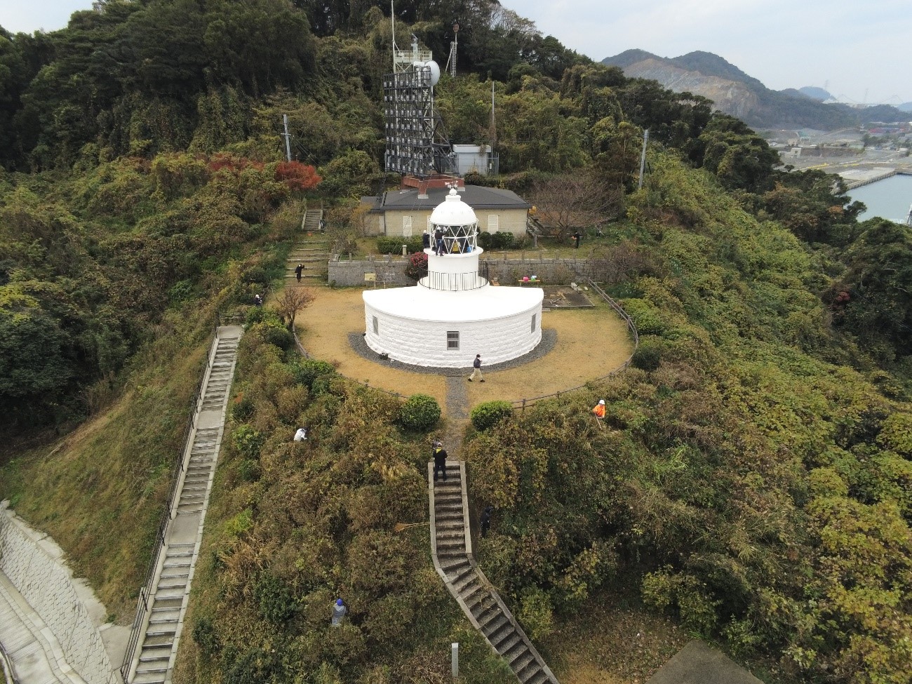 ※海上保安庁提供ドローン空撮、清掃活動中の「美しい部埼灯台を守る会」の様子
