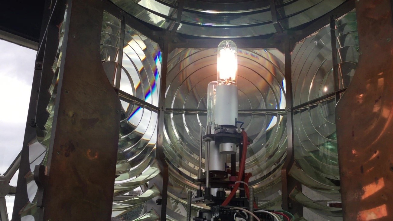 中心にある光源によって周囲にプリズムの様に反射する3等小型のフレネルレンズは90秒で1回転し、約32キロ先の遠くまで光を運ぶことができます。夕刻、辺りが暗くなると自動的に点灯し、レンズが廻り始めます。光源となるメタルハライドランプは初めエメラルドのように緑色に光り、すぐに白光へ変化します。