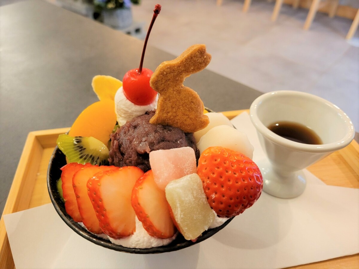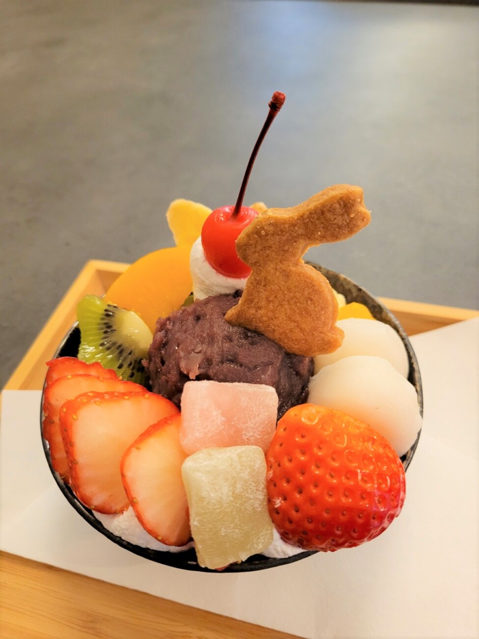 今回は「季節のクリームあんみつ(いちご)」を注文。丁寧に店内仕込みされた甘さ控えめのあんこと、いちごをメインにしたフルーツ、白玉、求肥、アイス(バニラ&抹茶)の組み合わせが楽しめる和スイーツです。取材日は、うさぎのクッキーがトッピングされ、さらにかわいらしい見た目になっていました。