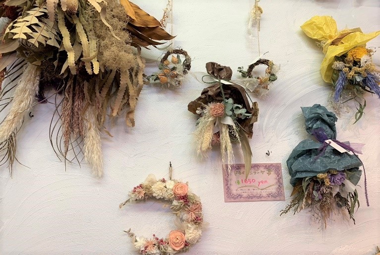 店内には天井いっぱいのドライフラワーが飾られており、それらを使ったリース作りも人気とのこと。
