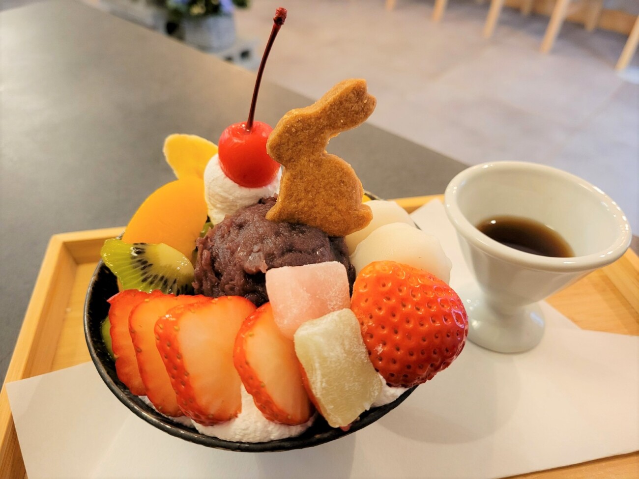 今回は「季節のクリームあんみつ(いちご)」を注文。丁寧に店内仕込みされた甘さ控えめのあんこと、いちごをメインにしたフルーツ、白玉、求肥、アイス(バニラ&抹茶)の組み合わせが楽しめる和スイーツです。取材日は、うさぎのクッキーがトッピングされ、さらにかわいらしい見た目になっていました。あんみつに添えられた黒蜜は沖縄の黒糖を使用したもの。あんこや黒みつ、アイス、果汁などすべてが混ざった最後の一滴までおいしく楽しめます。