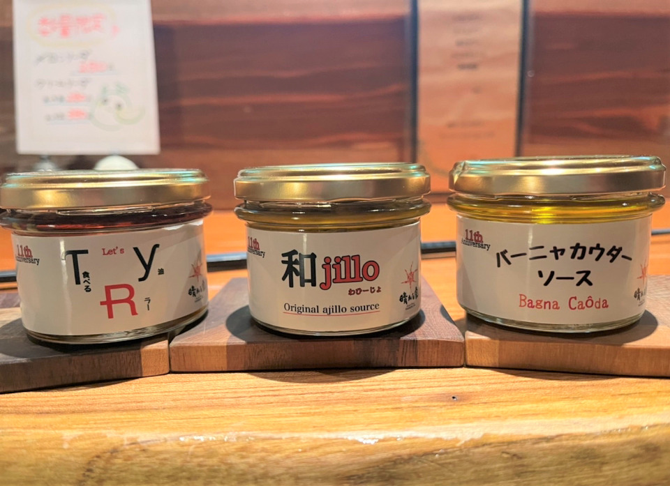 こちらはテイクアウト商品の「晴れる家オリジナル3種のオイルシリーズ」。写真左から、ガーリックの香ばしさが際立つ具だくさんな「食べるラー油」、昆布・鰹・塩麹を使った和テイストな「アヒージョソース」、アンチョビ・ニンニク際立つ「バーニャカウダソース」があり、自宅でもお店の味を味わえます。