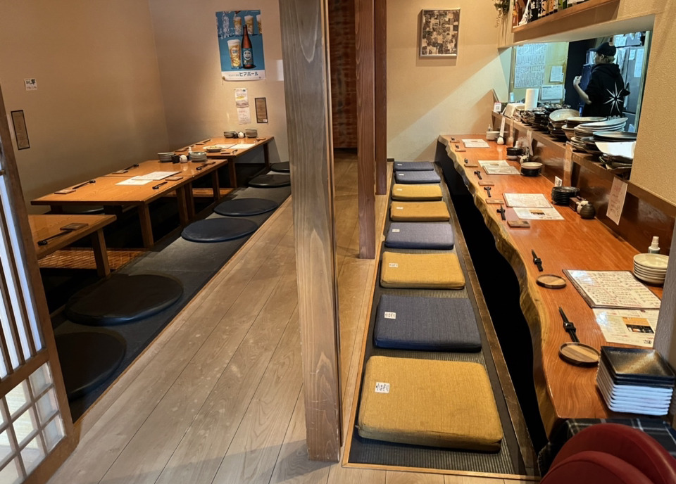 カウンターと4人席3席が全て1フロアになっていて圧迫感なくゆったり寛げます。もちろん靴は玄関で脱いでるので足元もずっとラクラクです。