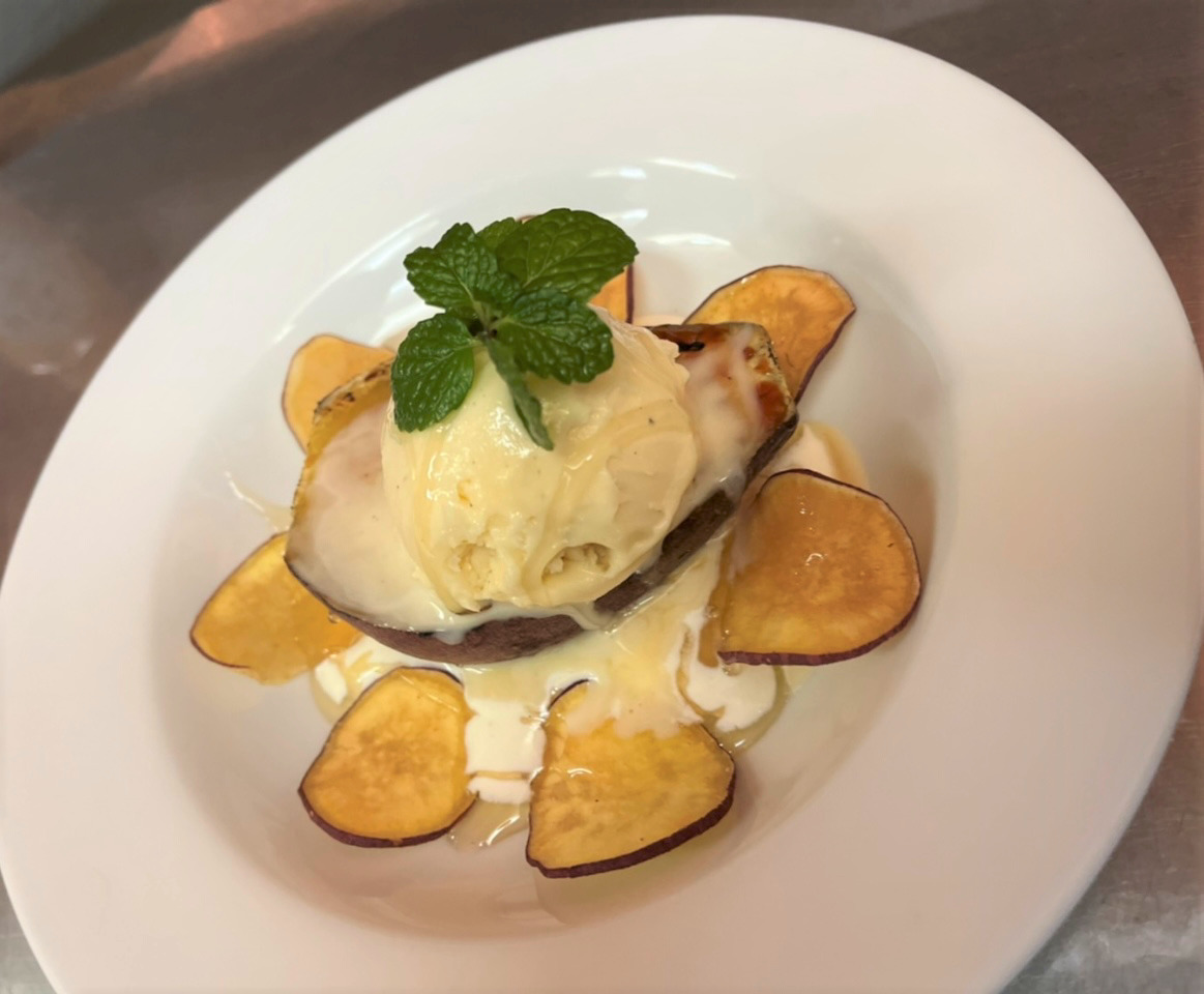 店長の片腕になっている女性料理人が手掛ける創作スイーツも人気。季節によって変わりますが、今の時季ならこの「ホクホク焼き芋バニラ乗せハチミツクリームソース」。焼き芋にバニラが合わないわけがない中でハチミツクリームソースまでかかっちゃってます!