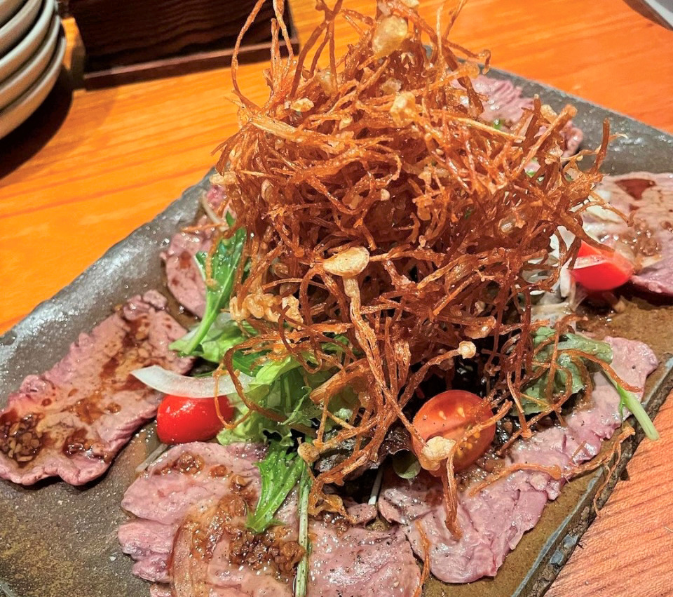 肝心なグルメを一部紹介すると、まずは「炙り和牛のカルパッチョ」から。レアなお肉に野菜や揚げエノキを巻いて食べれば見た目の鮮やかさ、お肉の旨味を存分に味わえます。店長に相談すると、カルパッチョはお肉に限らず魚介類もいろいろ工夫してくれますよ。