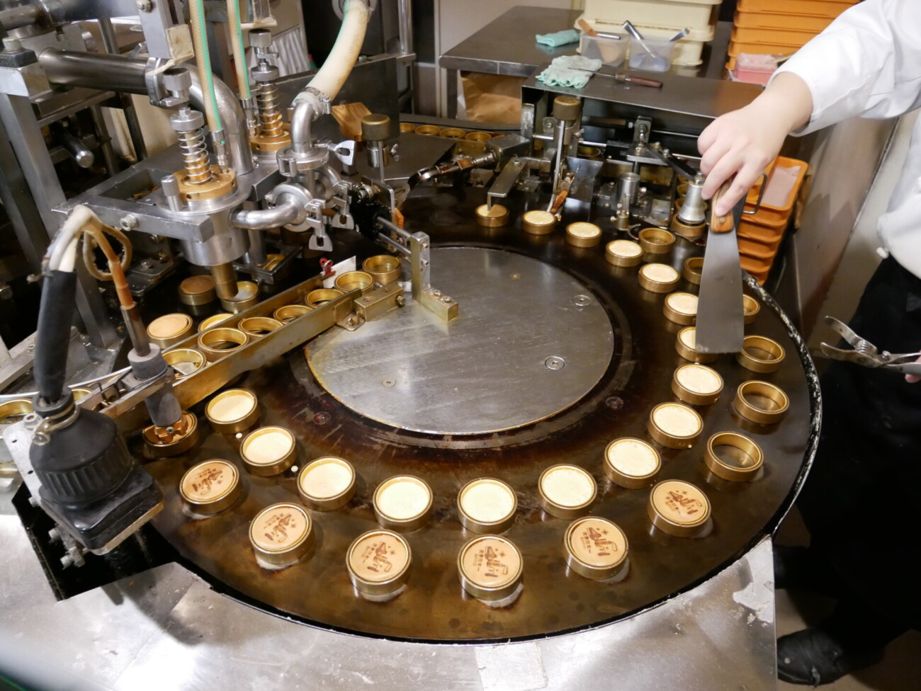 直径約5センチ、高さ約1.9センチのお饅頭は、『カチャン カチャン』と北九州市民にはおなじみの音を響かせながら店頭の機械で丁寧に手作りされています。カステラ風の生地で白あんを包んだ昔ながらの優しい味わいが子どもから高齢者まで幅広い年代の人たちに愛され続けてきた井筒屋名物です。