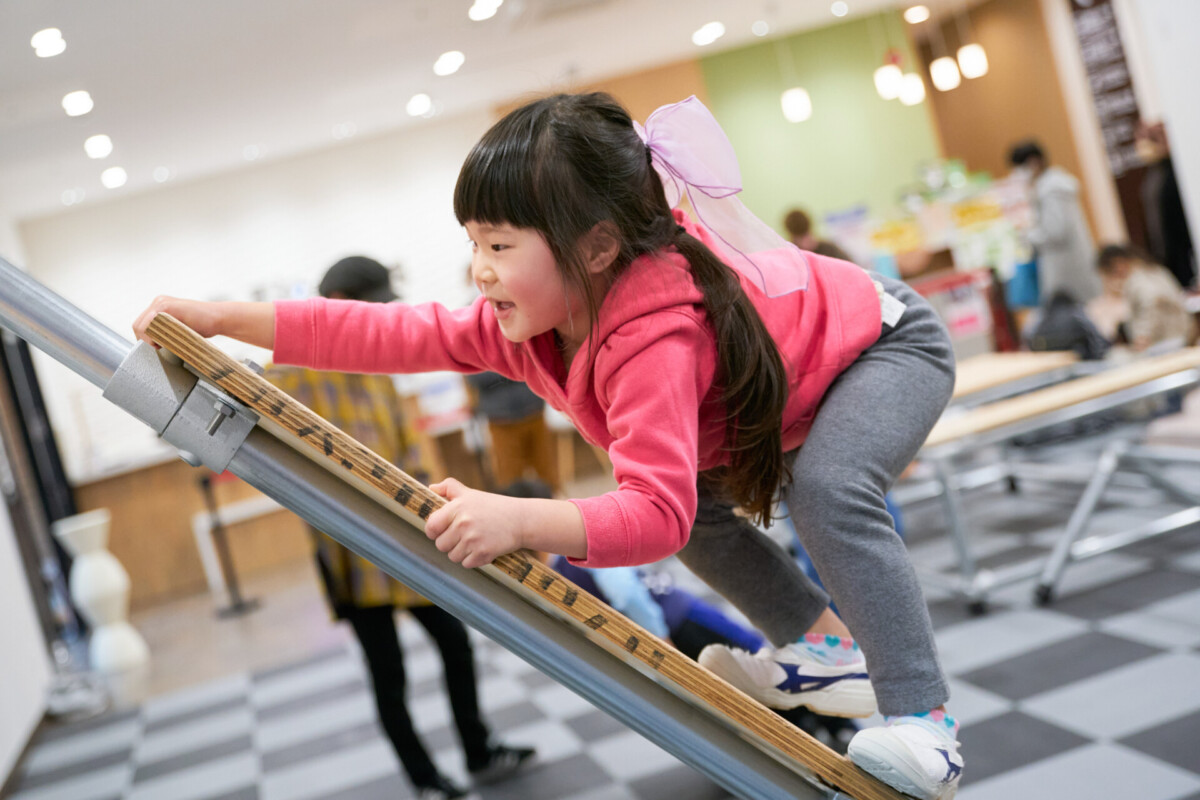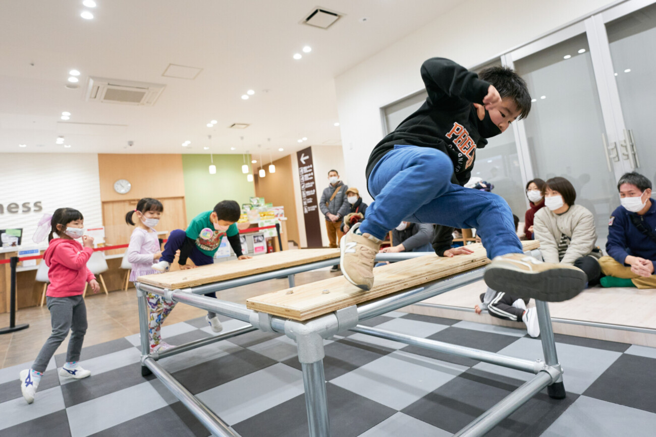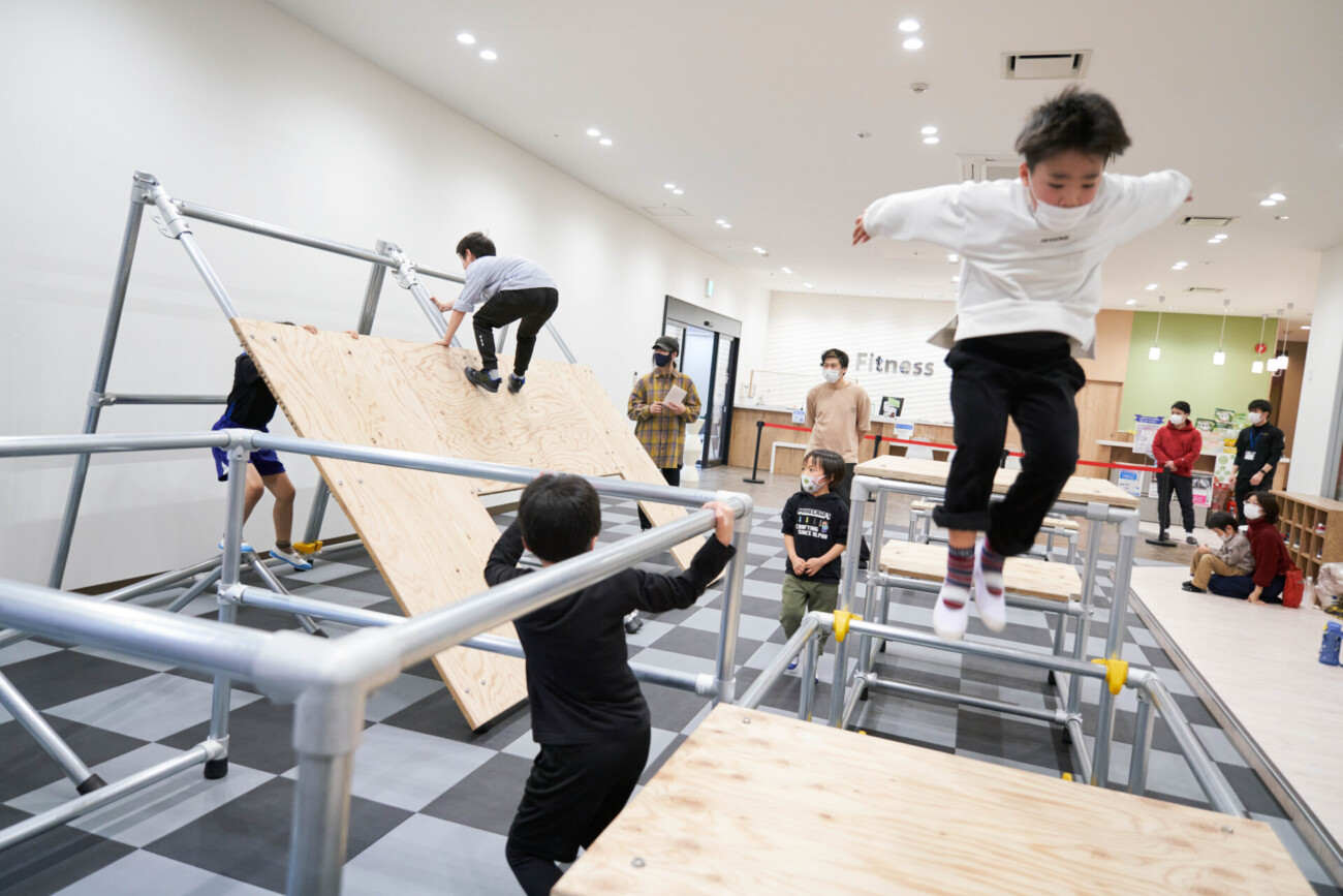 イベントでは、いろいろな遊具を使って自由に遊び、パルクール体験を楽しみます。