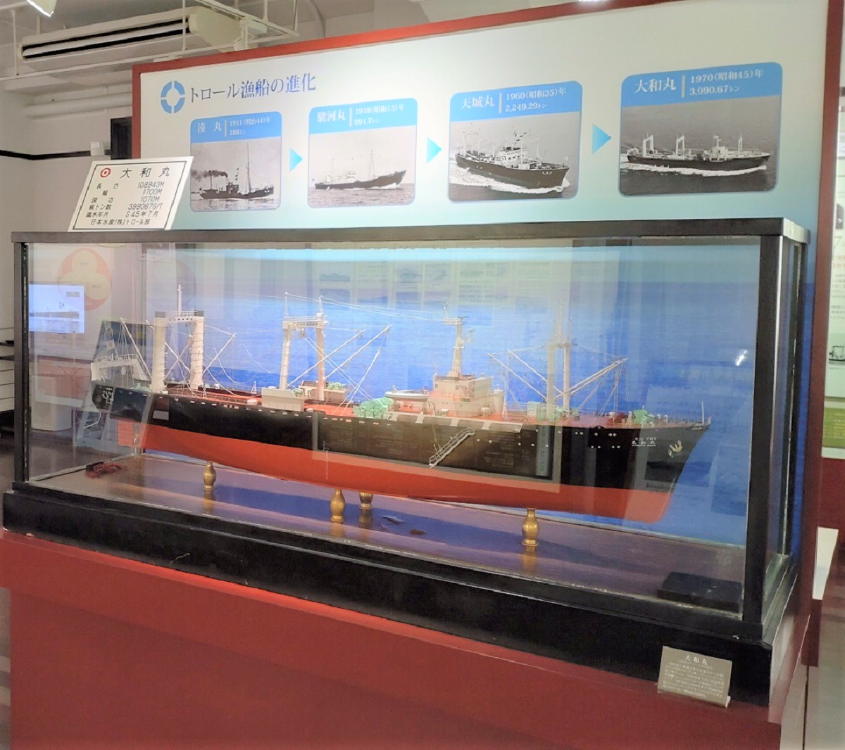 ニッスイは200海里の設定(1977年)がされるまで、世界各地で漁をしていて、当時の漁船の模型がいくつも展示されています。