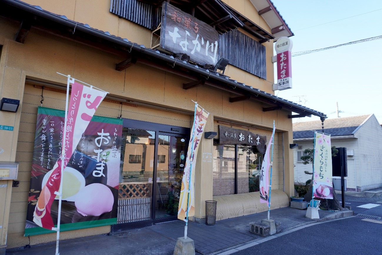 国道10号線バイパスを貫の交差点で貫山方面に向かって進むと右側に和菓子店「おたま本舗・なか川」の看板が見えてきます。