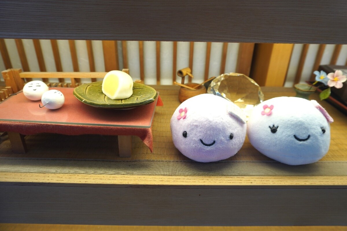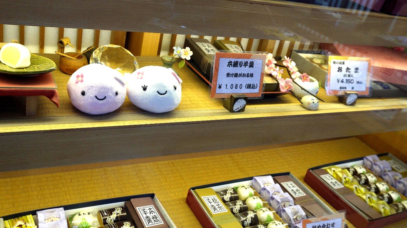 (アイキャッチ画像:なか川のキャラクターと噂の銘菓・おたまのディスプレイ)