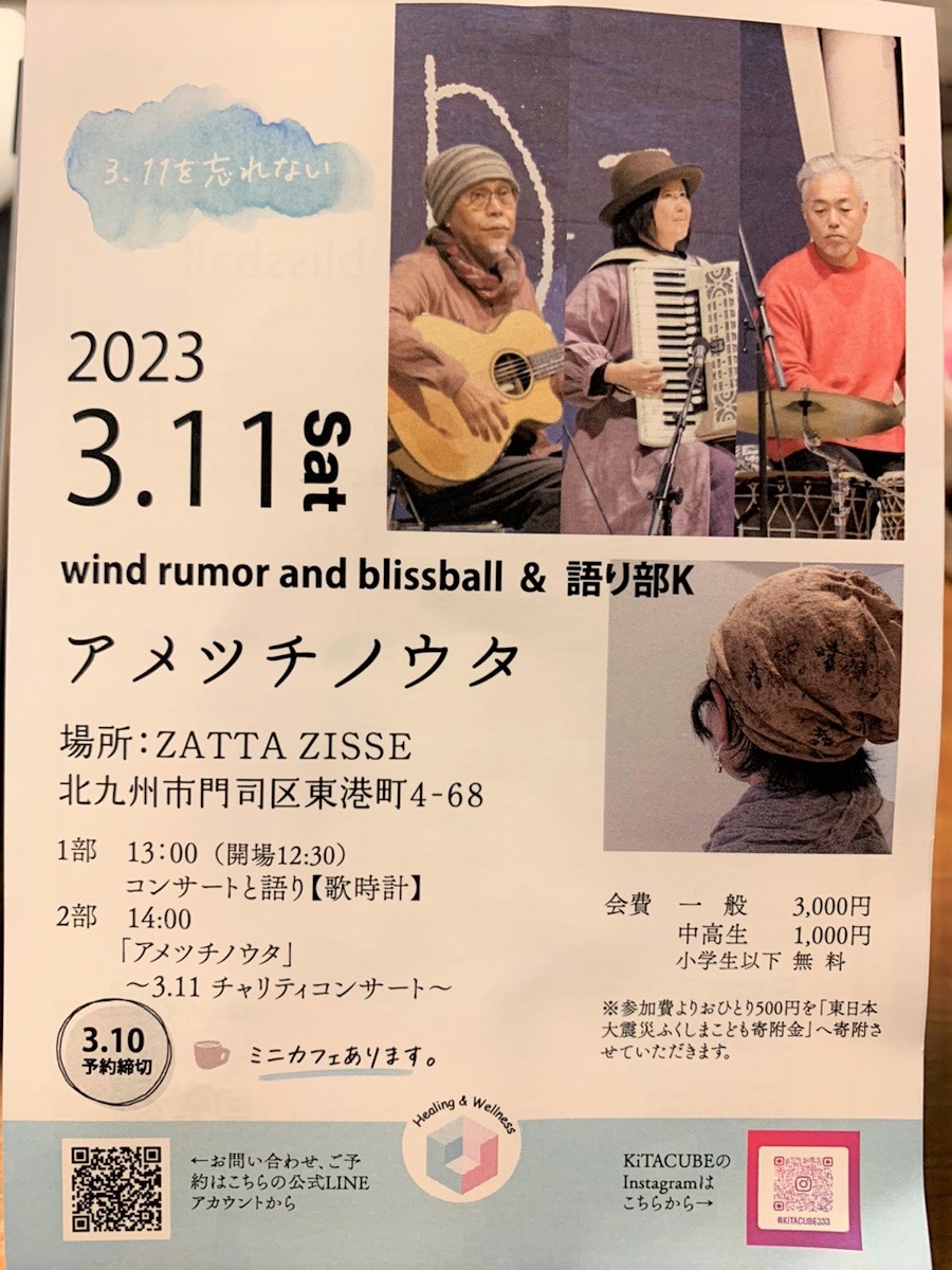 3月11日、「ZATTA ZISSE(ざったじっせ)」(北九州市門司区東港町4-68)で、3.11チャリティーコンサート「アメツチノウタ」~wind rumor and blissball & 語り部k~が開催されます。