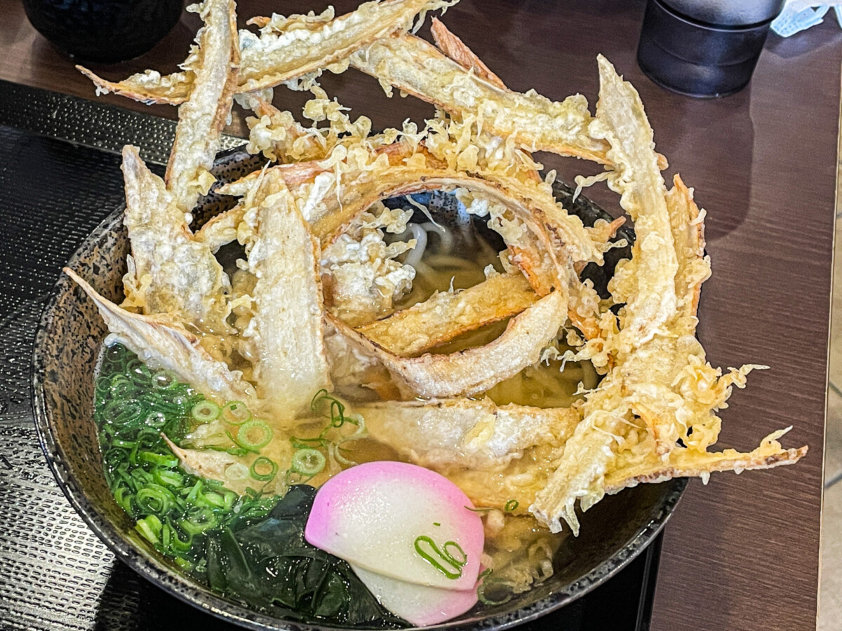 器からはみ出し、画面にも収まらないほどのごぼう天うどんは圧巻