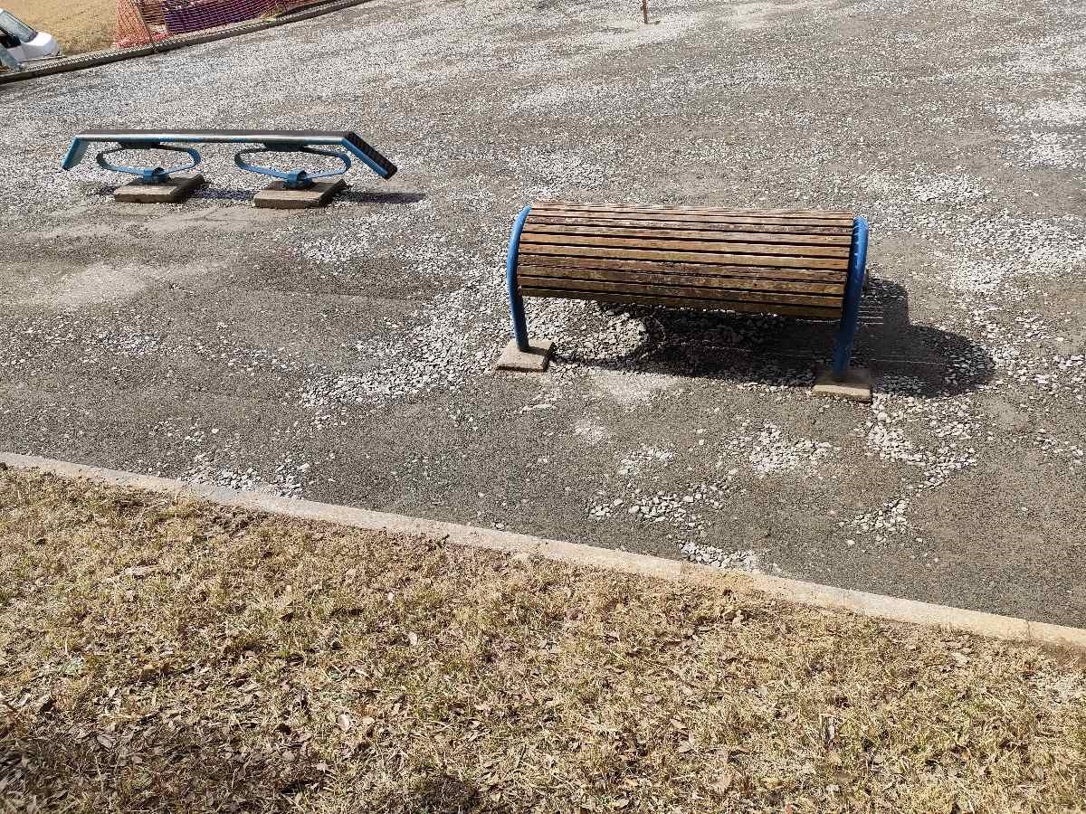 その隣の1段下の広場は、平行棒やバネ付き平均台などがあり、少し本格的に体を動かしたい人向けになっています。