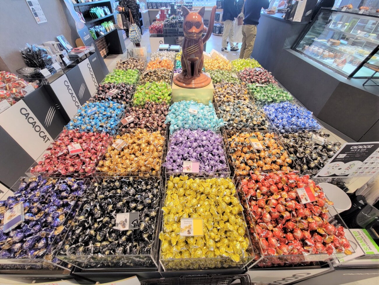 店頭にズラッと並ぶのは、猫の爪あとが目印の一口サイズのチョコレート「CACAOCAT」。濃厚なチョコレートでありながらもくどくなく、とろけるようななめらかな舌触り。さまざまなフレーバーのチョコレートを量り売り(100グラム950円)で販売してします。