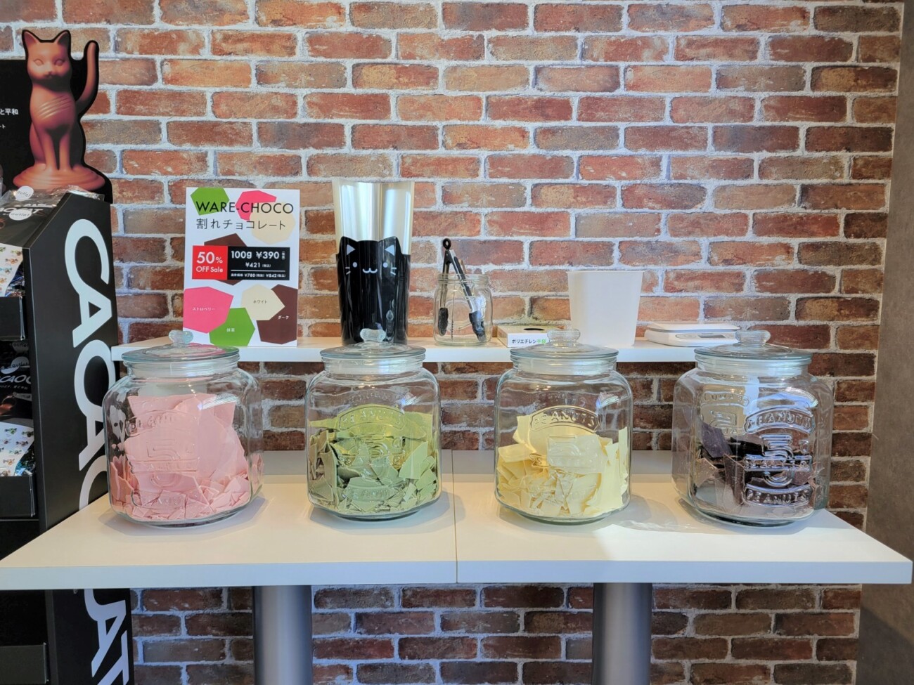 「ストロベリー」「抹茶」「ホワイト」「ダーク」の割れチョコレートは量り売りで販売。通常100グラム842円のところ、取材日はオープン記念で半額の100グラム421円で販売されていました。