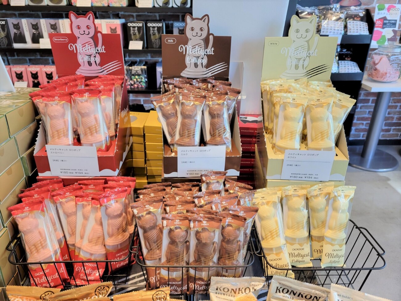 チョコレートクッキー「CACAOCAT Bake」、チョコレートをダクワーズ生地でサンドした「ダク」、バームクーヘンにチョコレートをサンドした「KONKON バームサンド」、『猫の舌』を意味するラングドシャにちなんで名付けれられたクッキー「にゃんぐどしゃ」、外側のチョコレートから食べ進めるときれいに猫型が現れる「にゃまチョコ」、猫の形がかわいらしい「メルティキャット ロリポップ」など、自分のおやつ用はもちろん、プレゼントにも喜ばれそうなものばかりです。