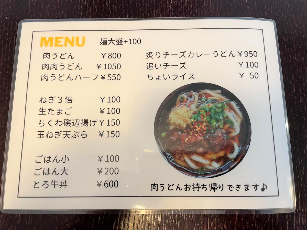メニューも門司港時代よりコンパクトに凝縮。肉うどんで勝負という意気込みが感じられます。