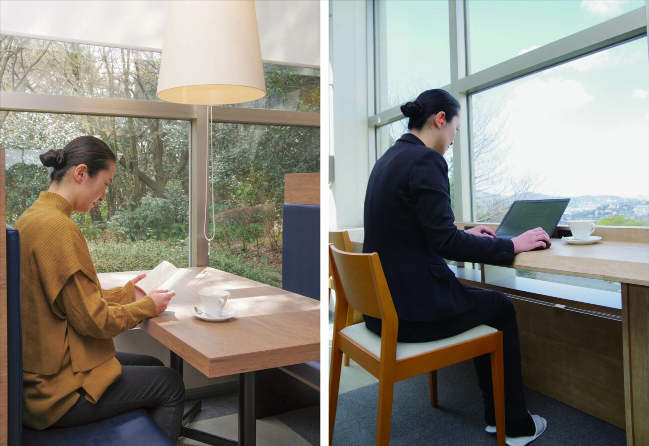 窓から響灘と市街を一望できるカフェ・ミュゼ。高台と緑に囲まれた開放感あふれる空間を、読書や仕事に集中できるスペースとして利用できるプランです。