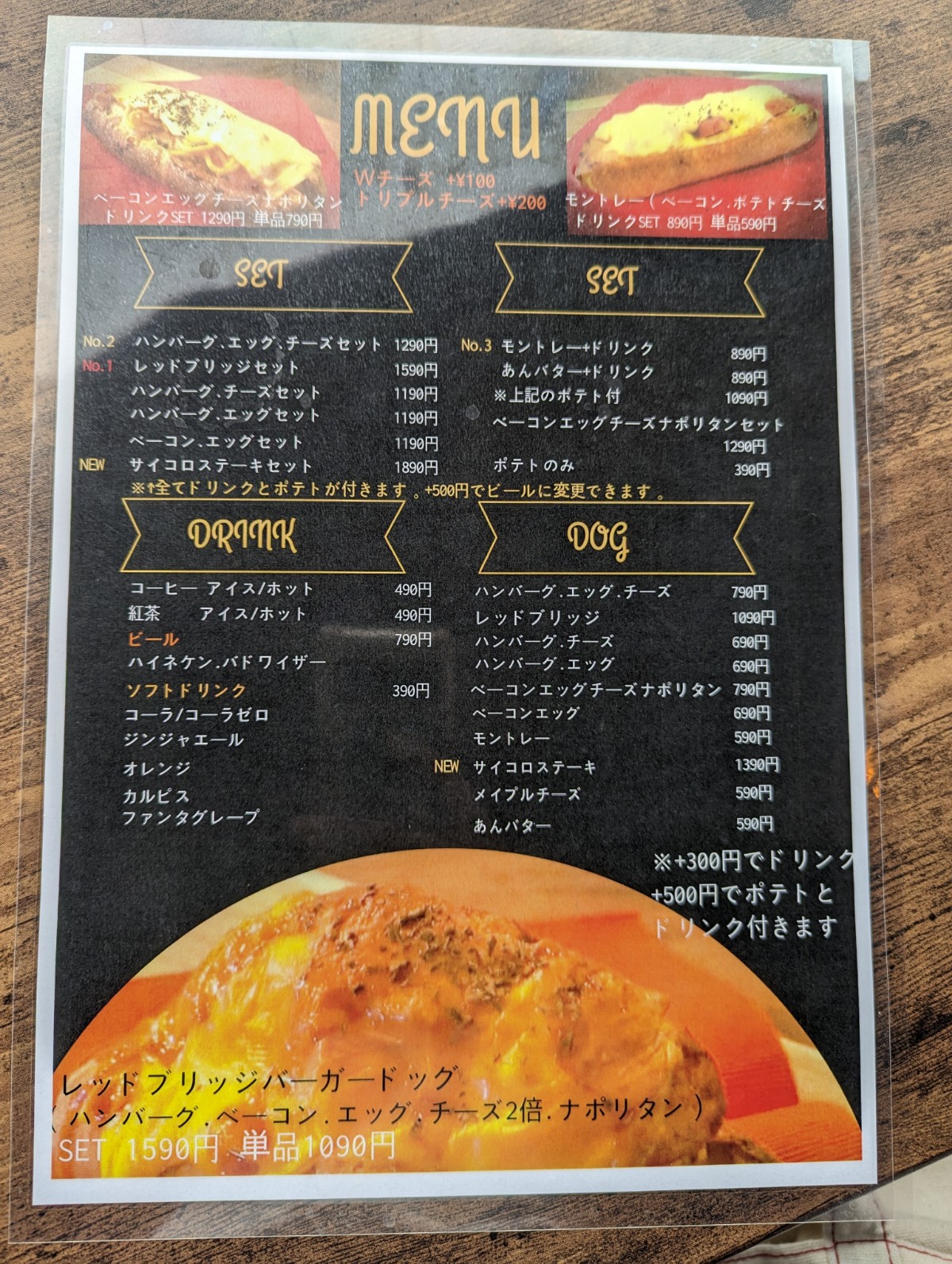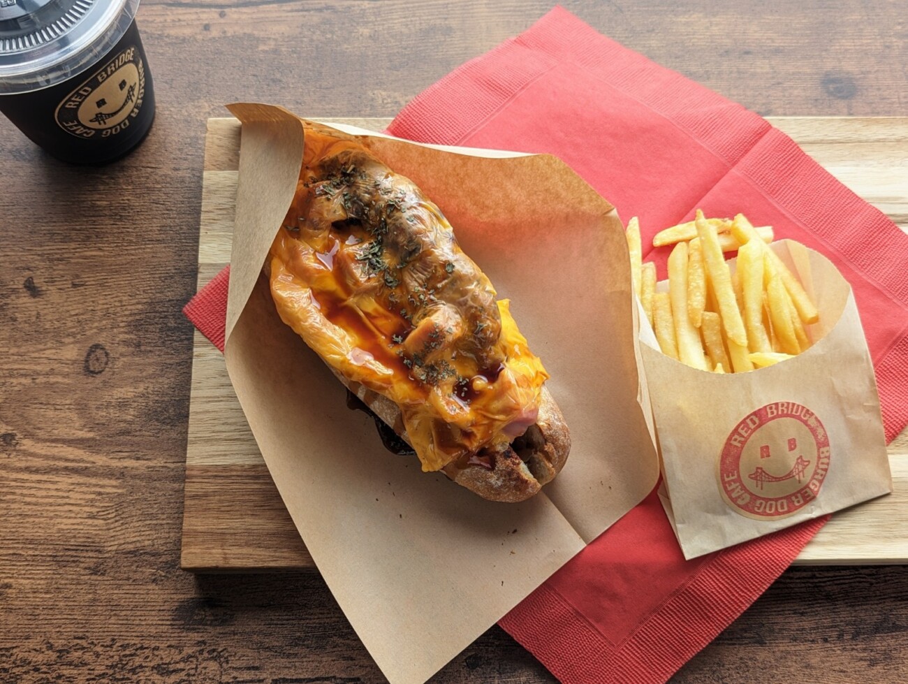 その中でも一番人気の「レッドブリッジセット」は、ハンバーグ、ベーコン、エッグ、ナポリタンの具材に、通常より2倍の量のチーズがかかった、ずっしりとしたホットドッグに、ドリンクとポテトがついたものとなっています。