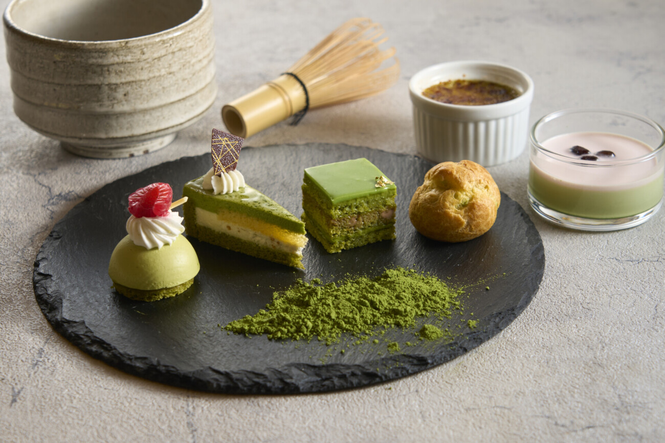 5月・6月のビュッフェのメニューには、「カツオのタタキと香味野菜」「ローストビーフのバゲットサンド」ほか8種の冷製料理、「スズキのブレバル風」「豚ロース肉のグリル マスタードソース」「シーフードと野菜の彩りピザ」「伝統の“海の幸のピラフ”」ほか8種の温製料理、スタンドクッキングで提供される料理「牛肉のプランチャ」「海老と茸のアヒージョ」や、「抹茶オペラ」「抹茶のクレームブリュレ」「抹茶のパンナコッタルビーチョコレートのソース」ほか15種のスイーツ、といったさまざまなメニューが用意されています。