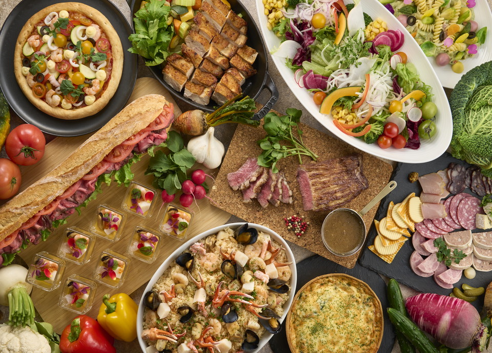 今回再開するランチタイムのフルビュッフェでは、前菜や色とりどりの旬野菜を使ったサラダなどの冷製料理に加えて、調理法や味付けにこだわった魚や肉などの温製料理、パスタやピザなどを含む全22種の料理を用意。さらにシーズナルスイーツ18種、シェフが出来立て料理を提供するライブキッチンメニュー2種を揃えた全42種の豊富なラインアップとなっています。