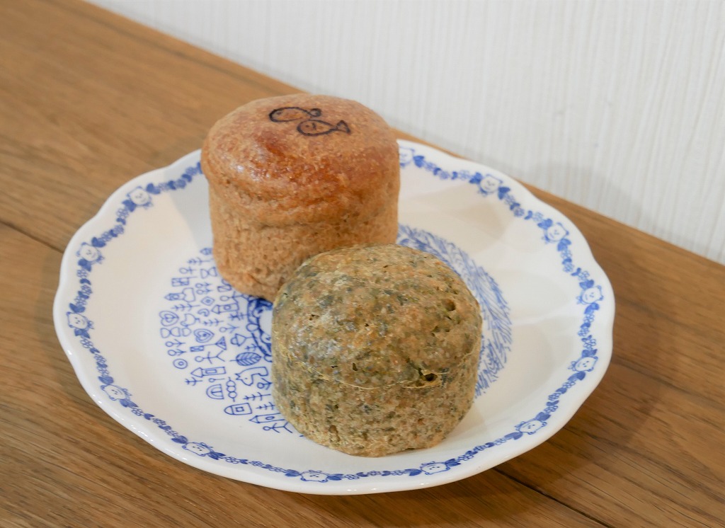 パンは、“かわのり”を生地に混ぜた川の風味たっぷりの全粒粉パン「カワカワパン」(100円)と、おさかなのマークが目印の黒糖パン「おさかなパン」(100円)の2種類。「なんぼクッキー」(6枚入り200円)は、全粒粉を使った型抜きクッキーです。