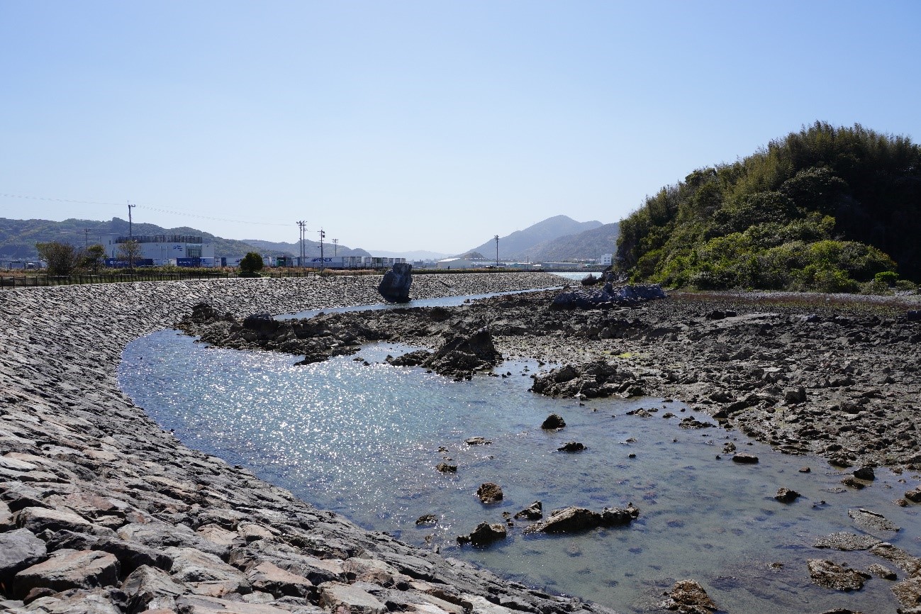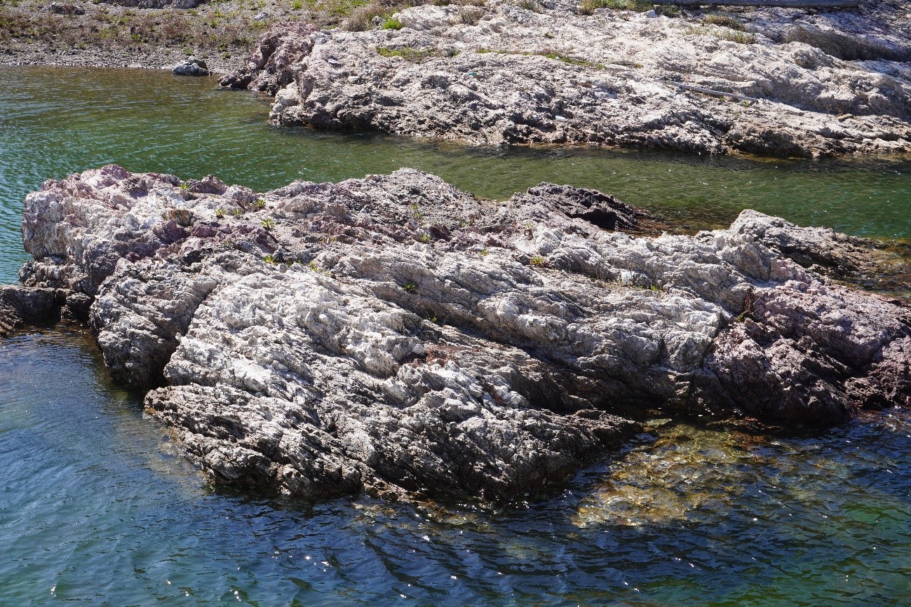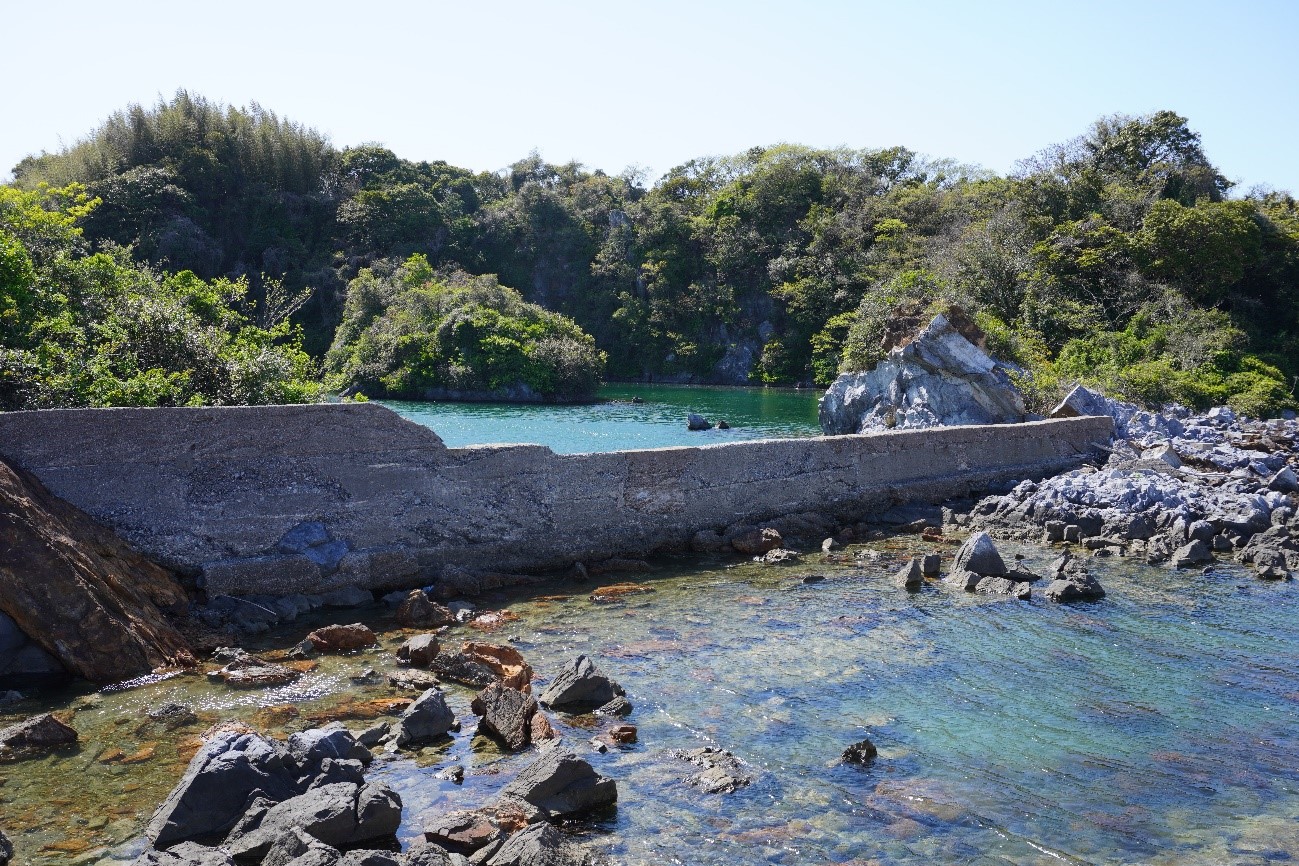 周囲は潮位の干満によってがらりと風景が変わります。ちょうど干潮のころはこのように荒々しい磯の風景となります。満潮から干潮に変わる頃には段差が堰となって、港の方に水が流れ落ちていくそうです。