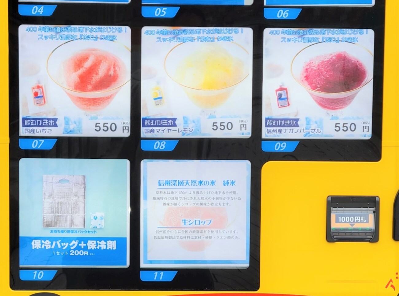 また、信州深層天然水の氷を使用した『飲むかき氷』も。「国産いちご」「国産マイヤーレモン」「信州産ナガノパープル」の3種類の味がありました。