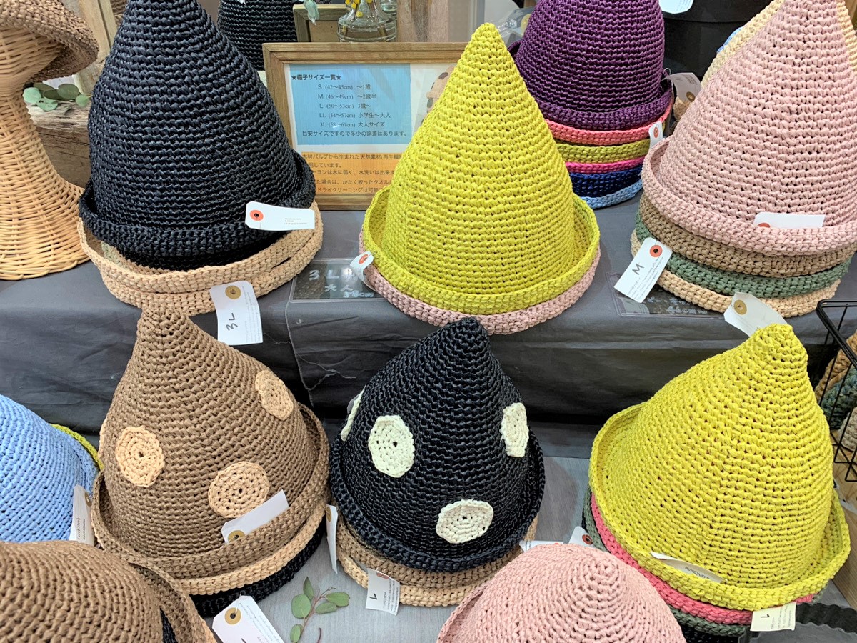 帽子は全14色、デザインは4種類(とんがり帽子のツバあり・ツバなし・ラインあり・ラインなし)。素材はレーヨンで、秋冬は毛糸のものも登場します。