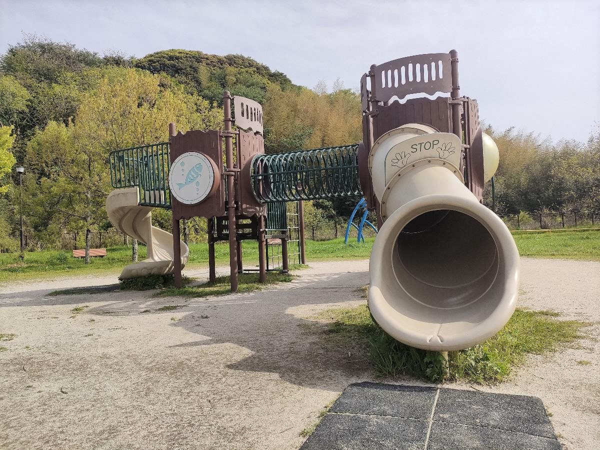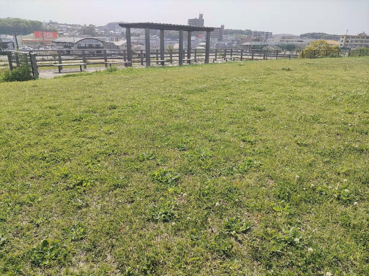 駐車場近くから順に、遊具広場、大きな芝生広場、上下2面の芝生広場、遊具広場、運動広場、展望台(園田浦城跡)、遊具広場となっており、とても広く遊べる所がたくさんあります。ちなみに筆者は駐車場から一番離れた遊具広場まで歩いて8分ほどかかりました。