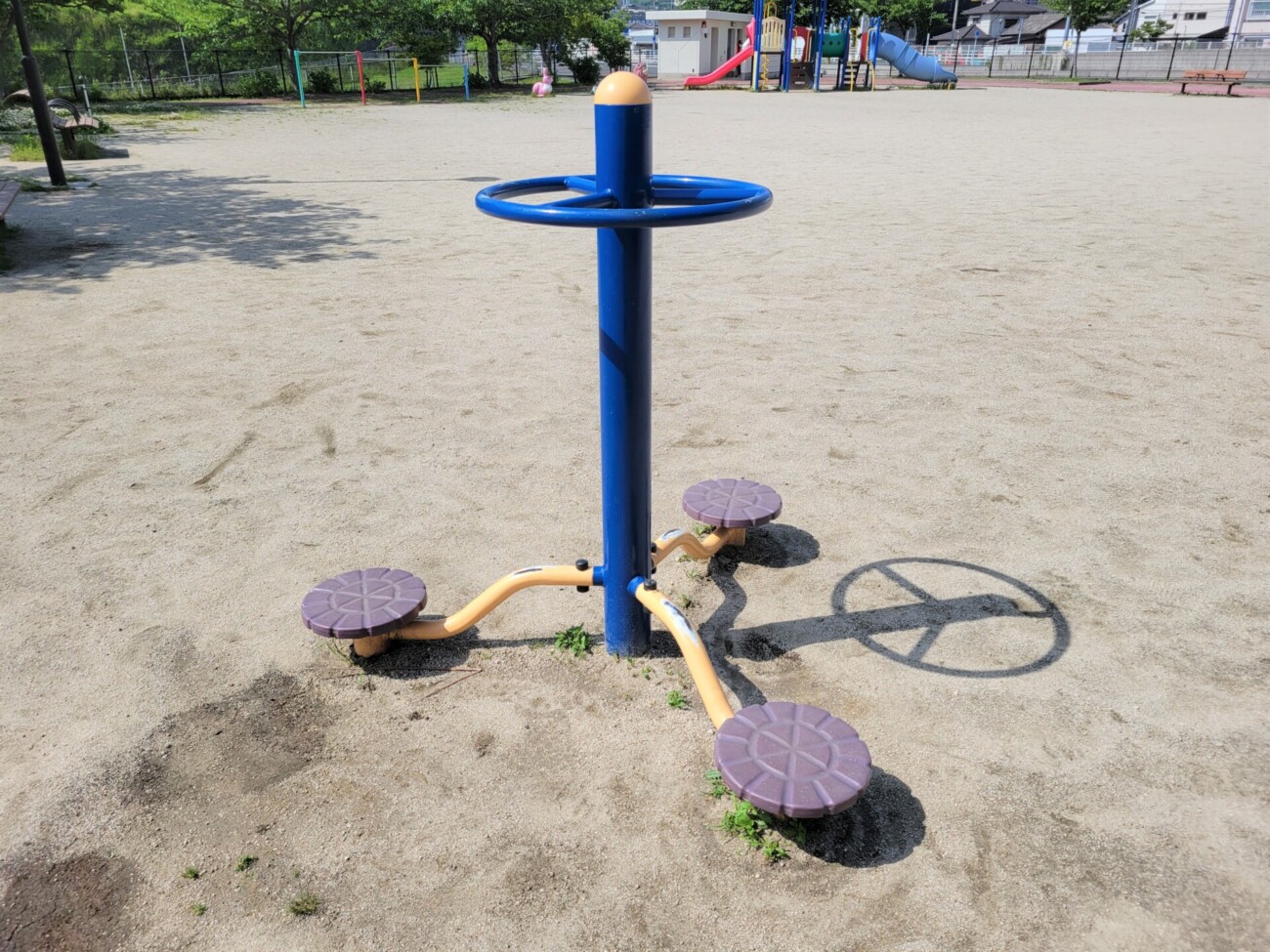 健康遊具はおなじみの背伸ばしベンチをはじめ、足つぼマッサージ、円盤に乗ってねじり運動をする器具、空中を散歩しているかのようなエアーウォーカーが設置されていました。