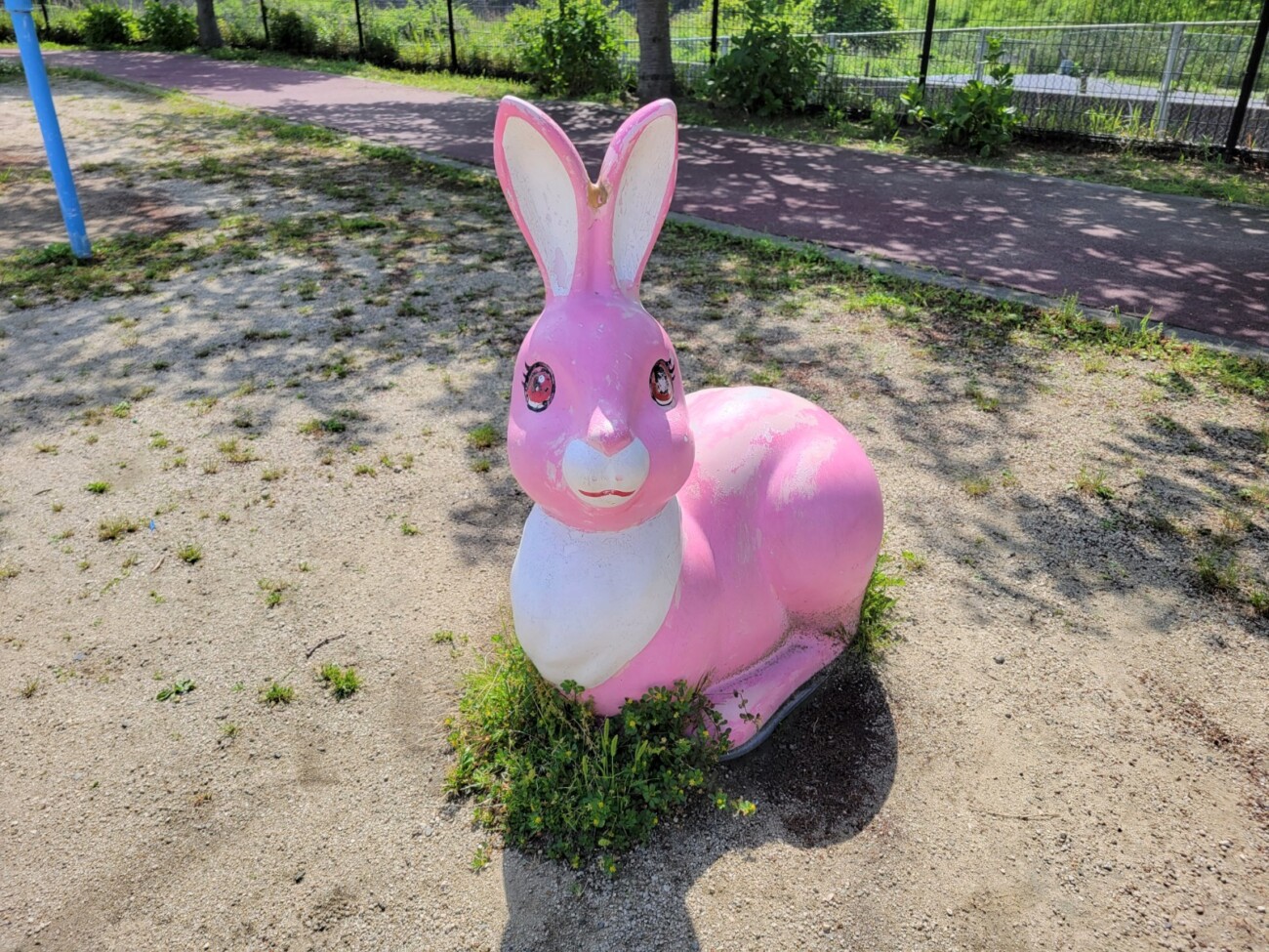 横を向いているウサギの目線の先にあるのは、複合遊具。楽しく遊ぶ子どもたちをやさしく見守っているようです。