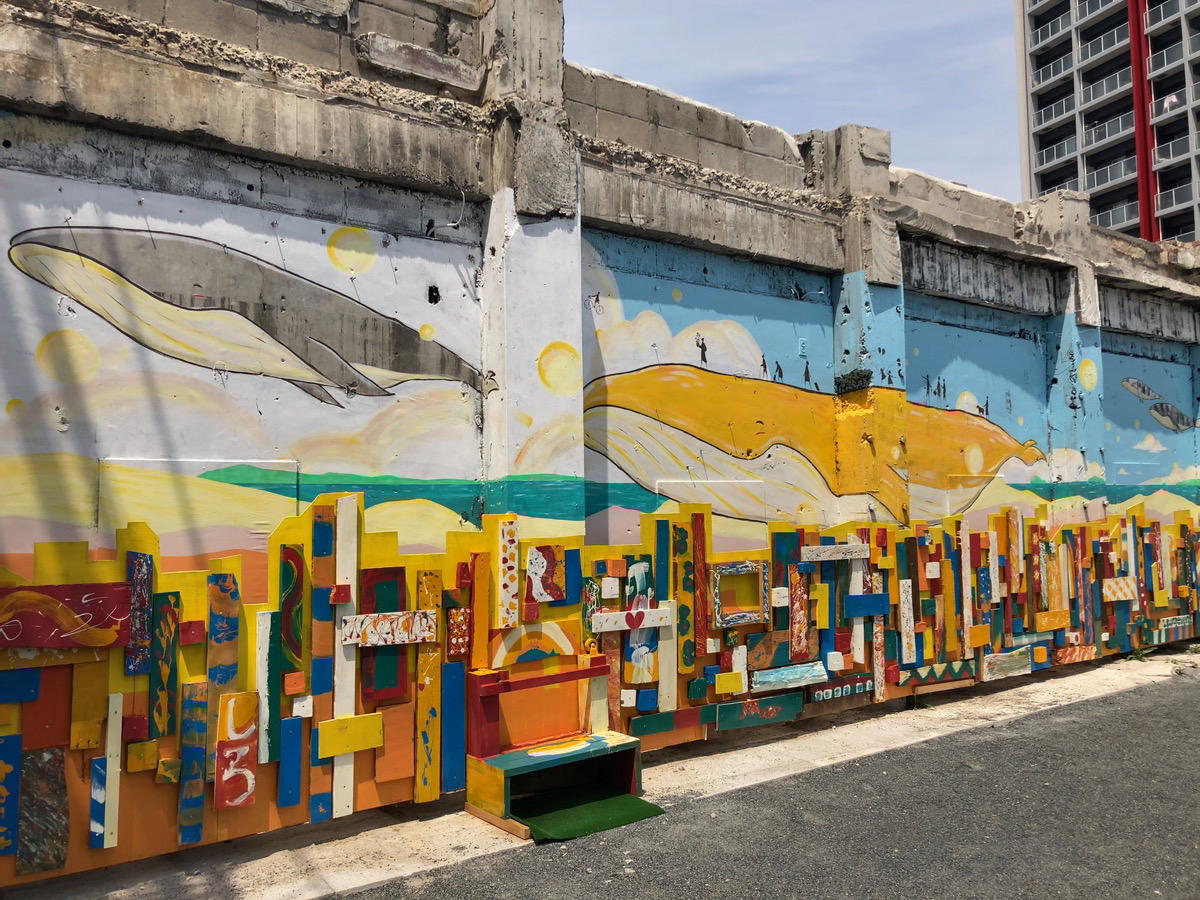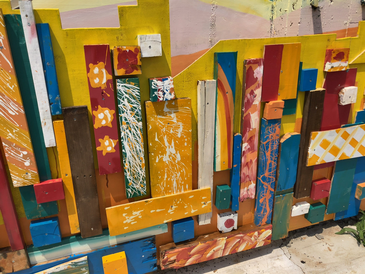 さまざまな色や模様がペイントされた木片が、壁画の存在感をどっと強めていて遠くからでも目を引きます。