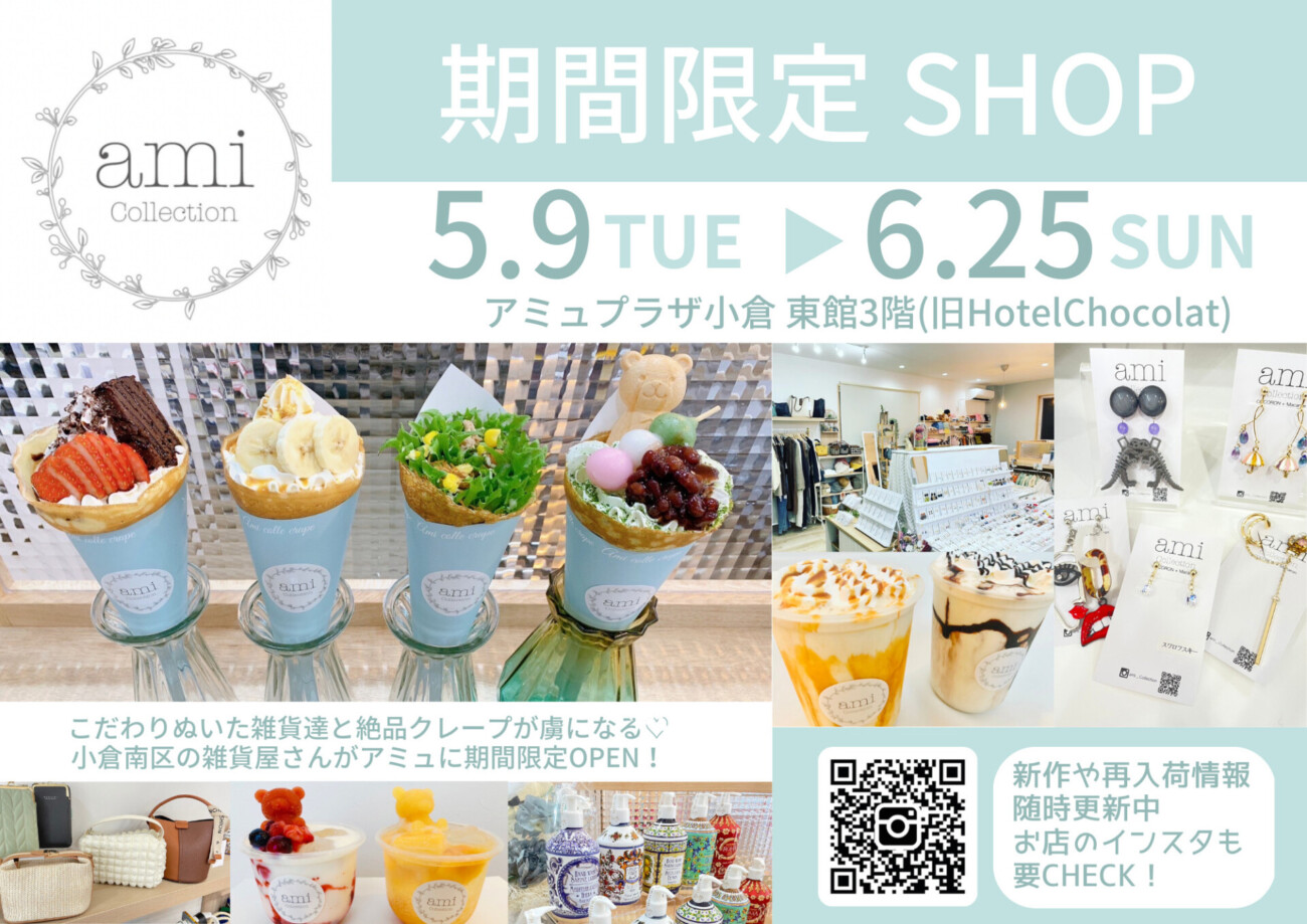 小倉南区田原新町に店を構える「ami Collection(アミコレクション)」が、5月9日~6月25日の期間限定で、「アミュプラザ小倉」東館3階特設会場に登場しています。