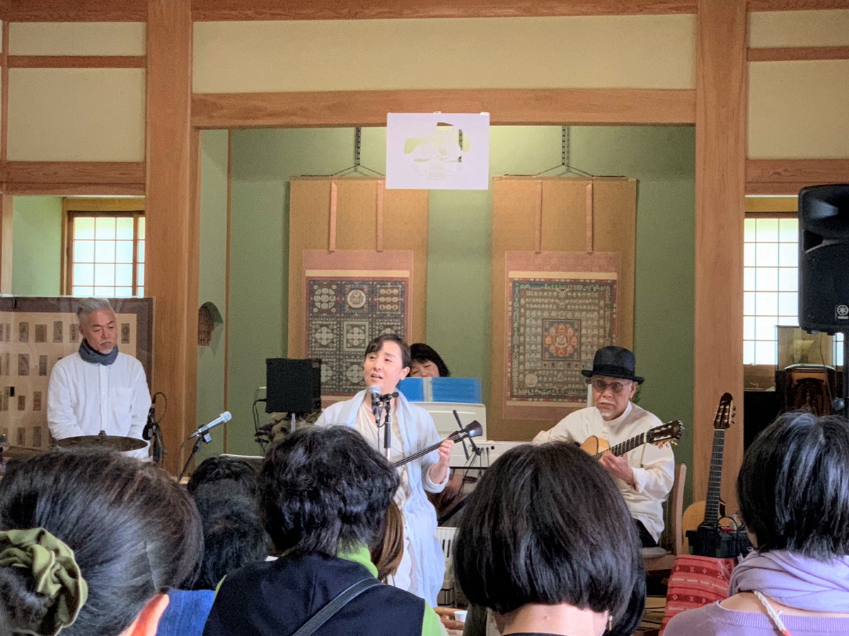 来訪時は沖縄の民謡ユニット「ネーネーズ」に在籍していた、こやまよしこさんを招いてのコンサートが開催されており、新緑の中、滝の音や吹き抜ける爽やかな風、自然を感じながら唄とともに祈りをささげるような、心洗われるひとときを過ごすことができました。